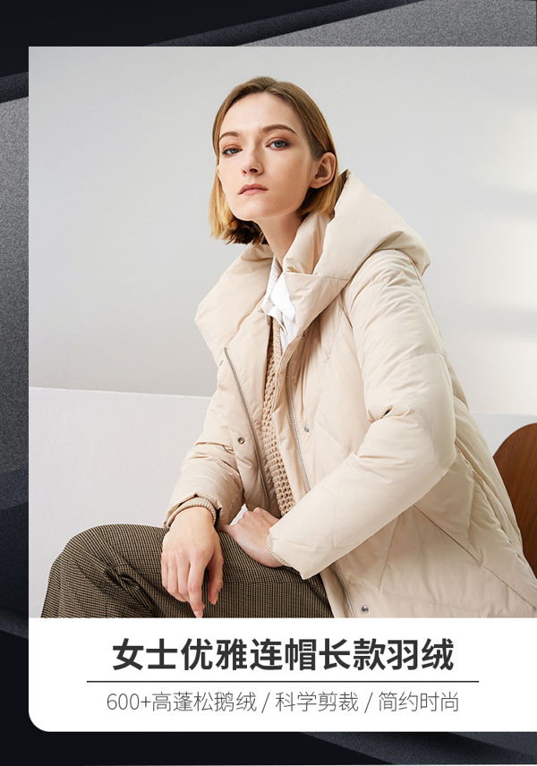精修H版型,立体裁剪工艺,下摆盖过膝盖,能更好地修饰身材。这款羽绒服风格设计偏向于时尚通勤风,不论上班通勤,还是城市户外都适合穿着。