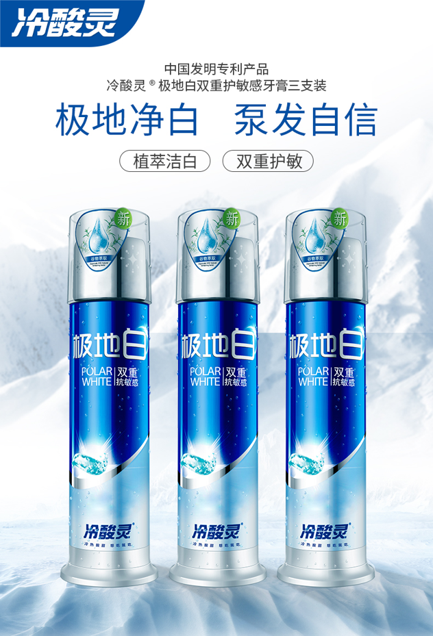 这款冷酸灵牙膏,采用特有的双重抗敏感专利配方,专门针对冷、热、酸、甜等食物引起的牙齿敏感和酸痛现象;含有精心研制的ICE极地冰爽因子,在刷牙带来清凉感,一扫清晨起床的困倦感觉,还含有谷物中萃取的洁白因子(植酸钠),能有效分解色素及牙渍,持久美白牙齿。