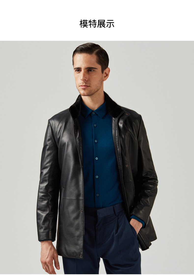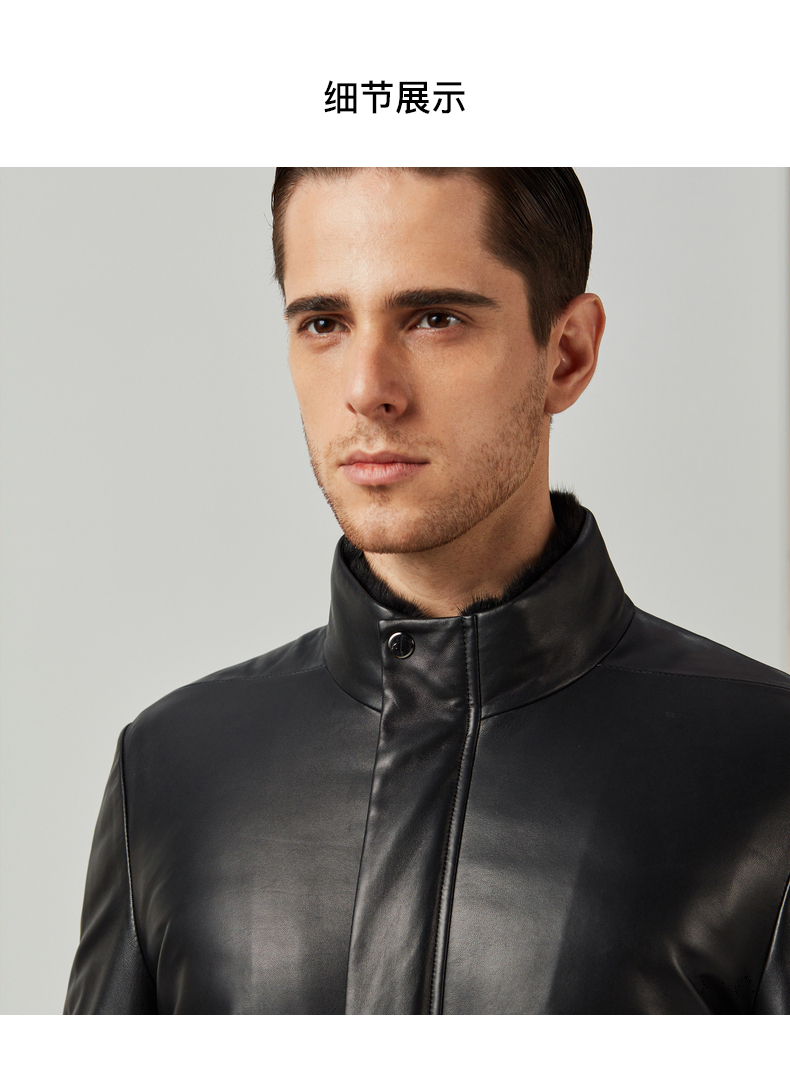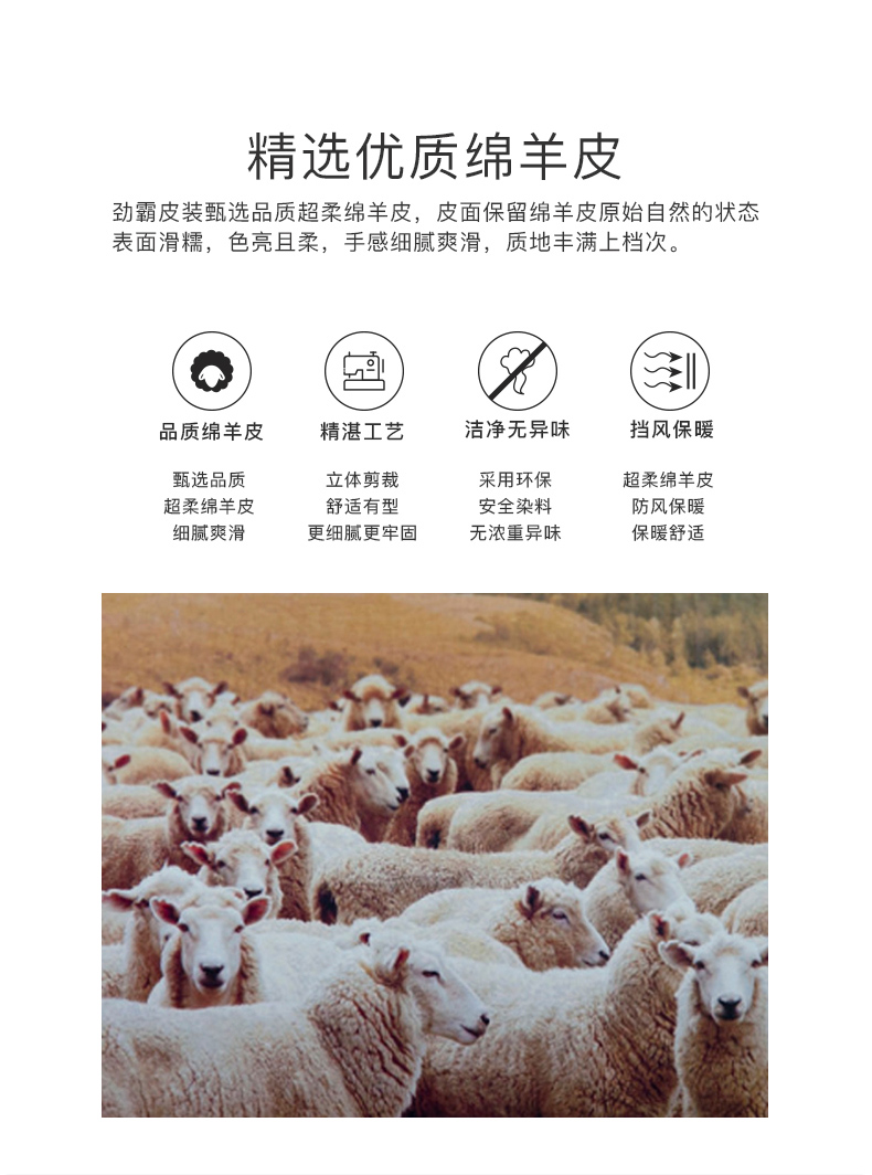 这款劲霸男装的皮夹克,表面采用100%绵羊皮制作而成,相比牛皮的,羊皮要柔软舒适很多,手感细腻,毛孔少,光泽鲜亮,质地上档次;而且秋冬天冷不容易开裂,容易保养。内里填充90%鸭绒,蓬松度高保暖效果更好,绵羊皮拥有防风防水的效果,同时不易钻绒。