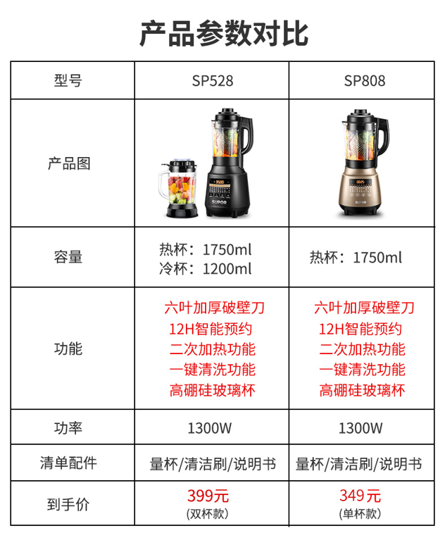 配置上:采用1300w大功率电机。动力强劲,可碎骨,配合进口6叶加厚破壁刀头和杯身六筋扰流柱,似食材可以充分搅拌,破壁细腻无渣,充分释放营养。配有灵敏温控传感器,智能控制料理时间和火力强度,实物营养可达到极致萃取。