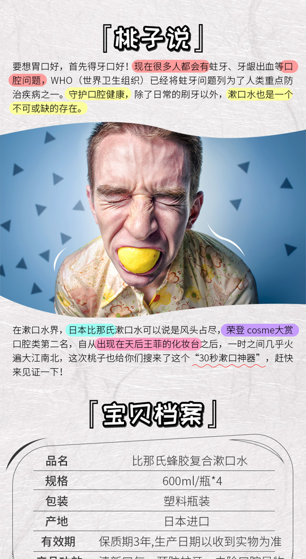 =129元 到手价(定金20+尾款109),Propolinse蜂胶茶复合漱口水是日本入选Cosme大赏商品,在日亚及国内都十分受欢迎。 内含茶叶萃取物、蜂胶萃取及天然木糖醇,具有杀菌作用并可有效清洁口腔内杂质,去除口臭和异味,保持一天的清新口气。蜂胶也有消炎的作用,能对预防口腔疾病有一定的好处。使用方法:每次10-15ml的量(约半瓶盖的量),20-30秒后吐出即可。