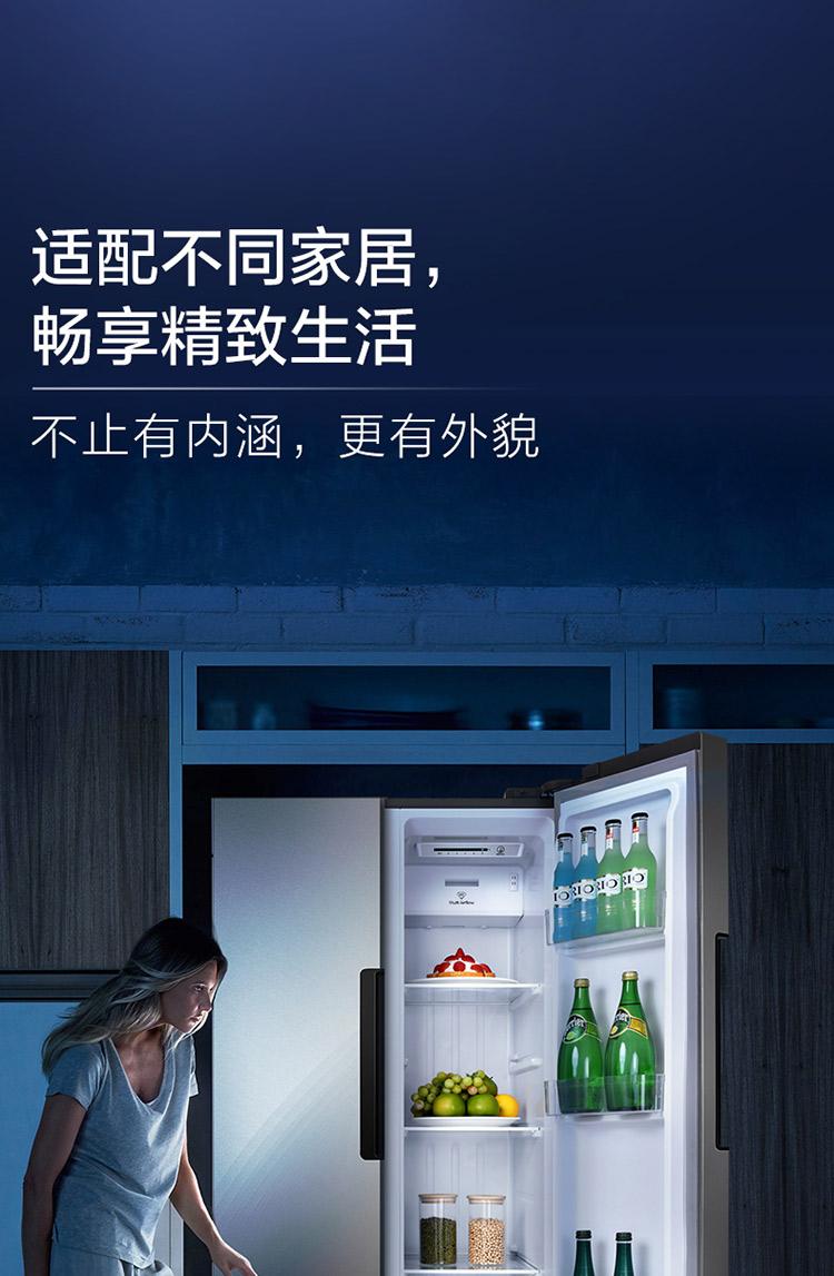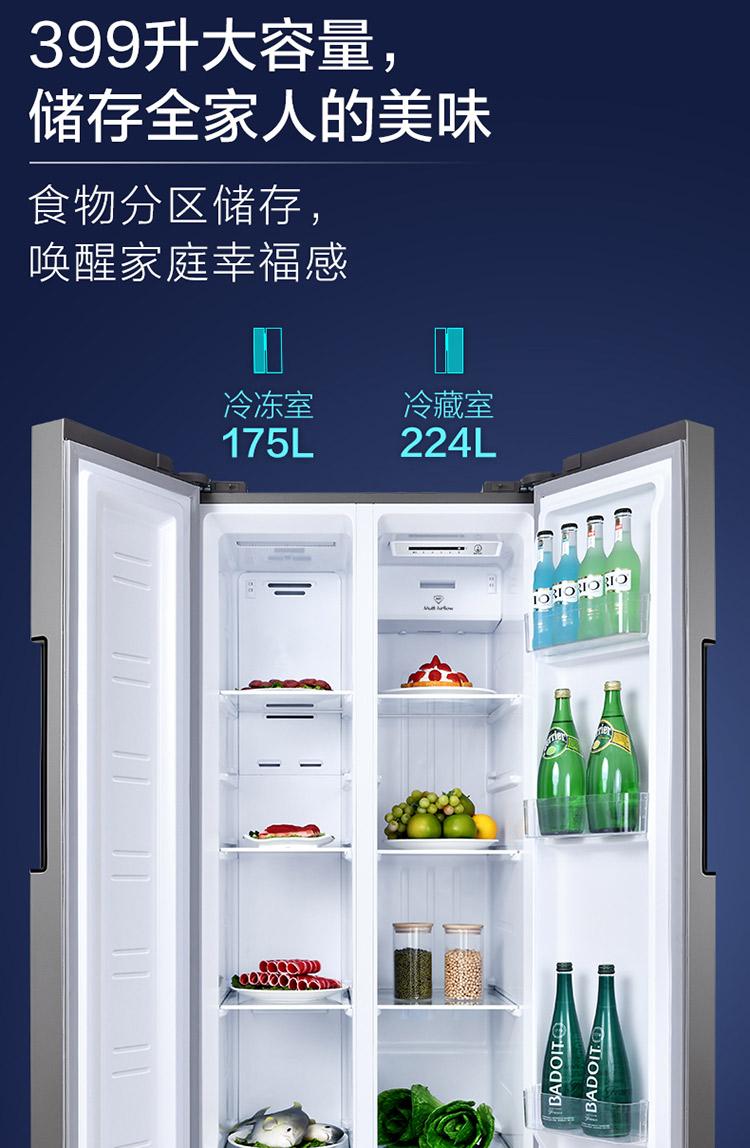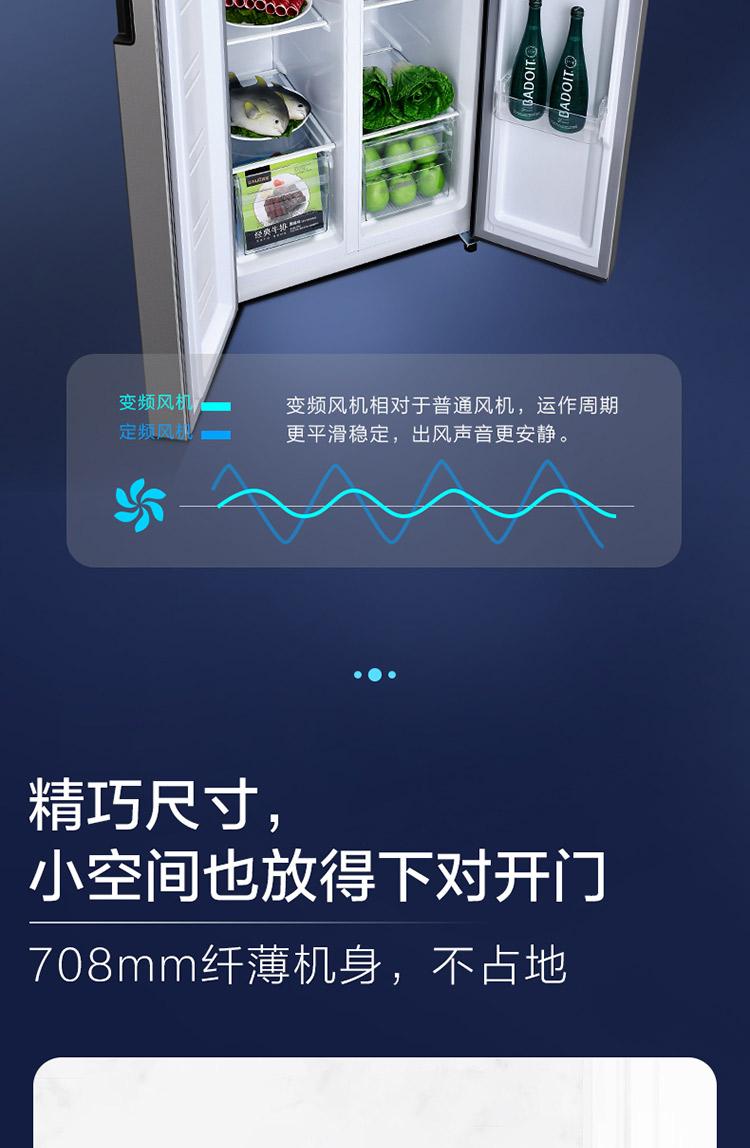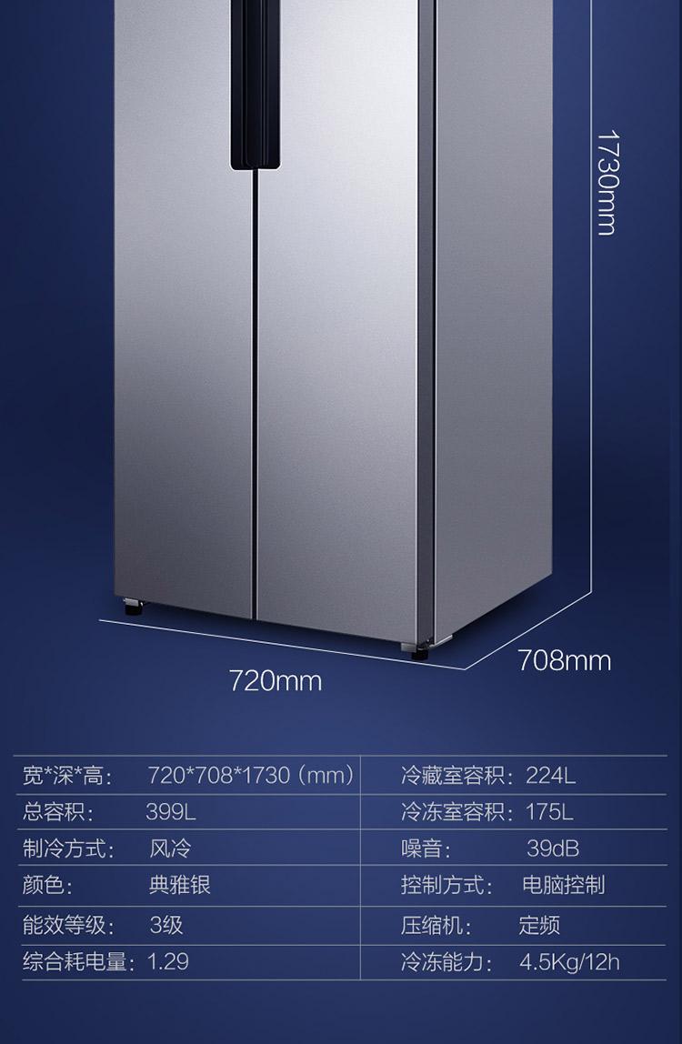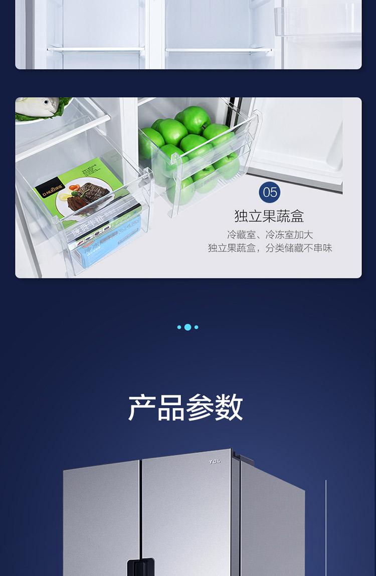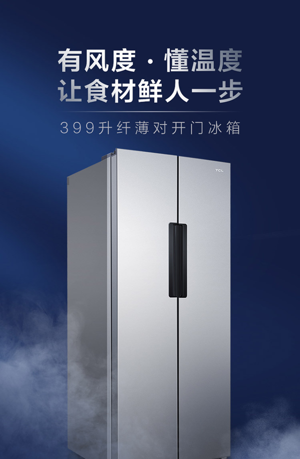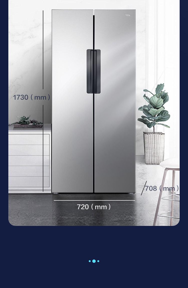 TCL专为中小户型设计的纤薄对开门冰箱,取物更加直观方便,冷藏室224L,冷冻室175L,各种食物分区存储,使用方便,宽深高分别为720mm、708mm和1730mm,占地小。