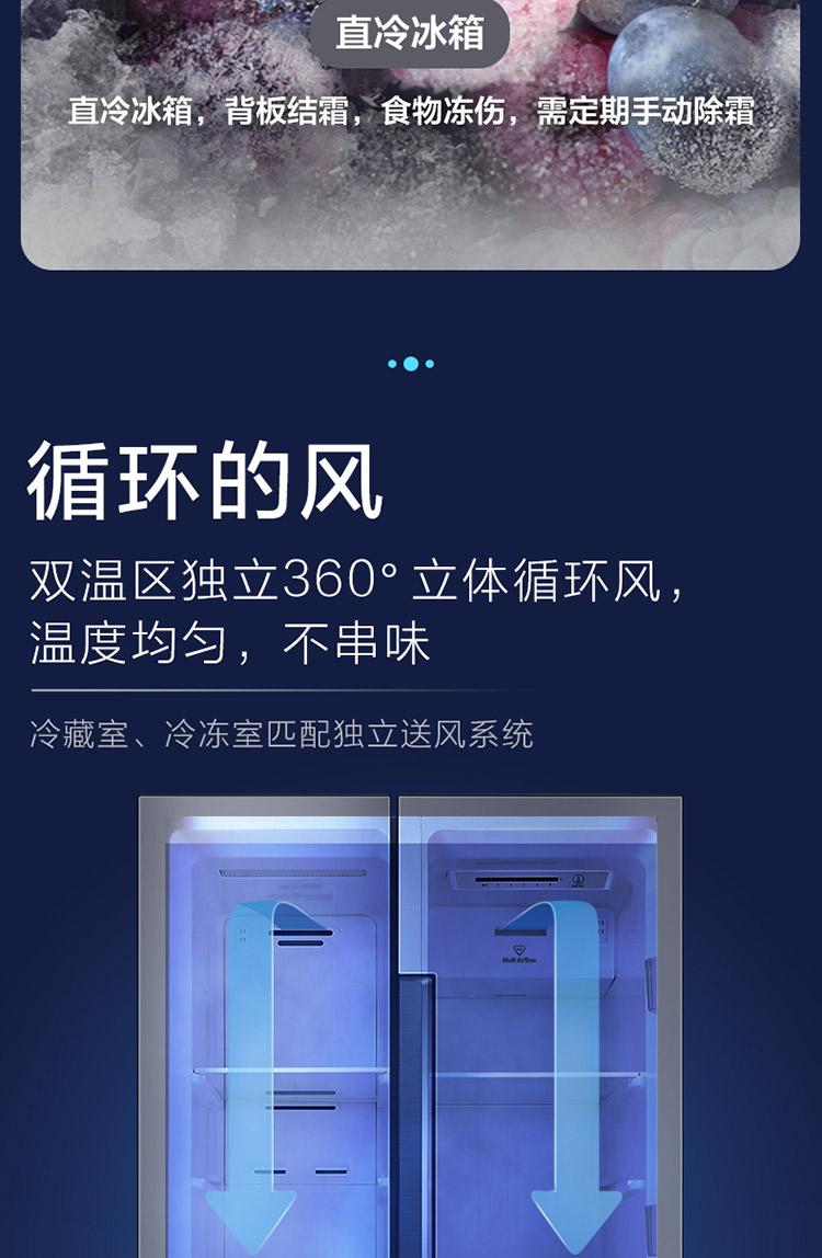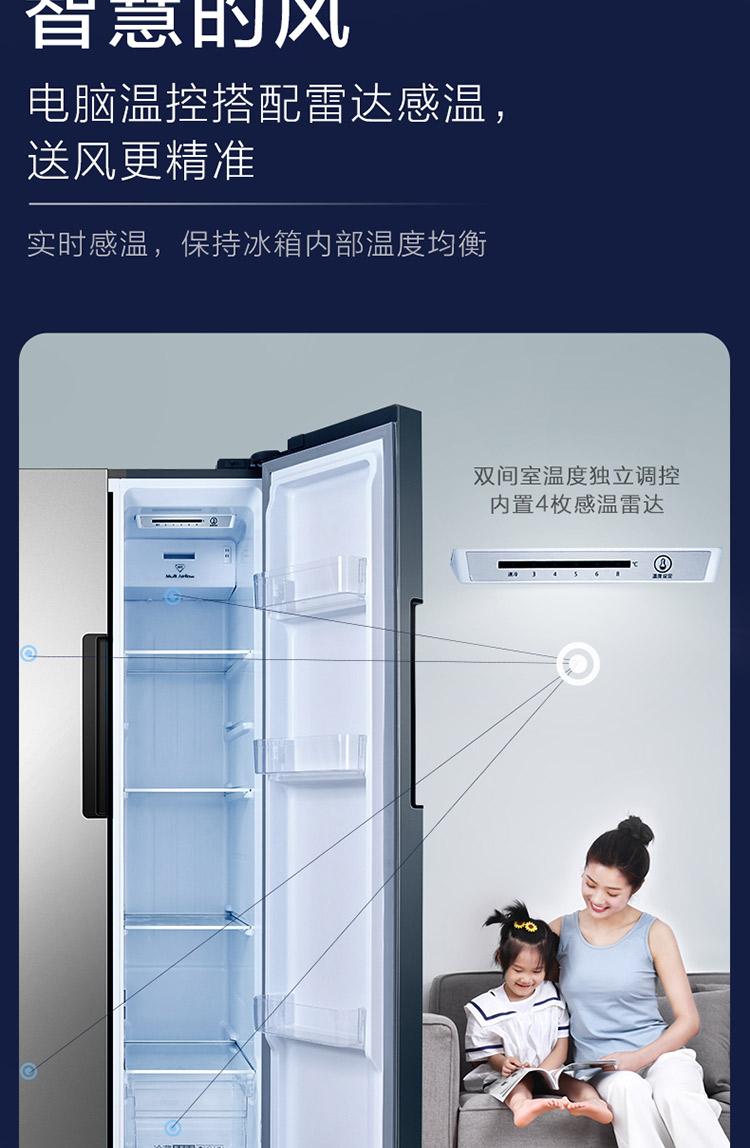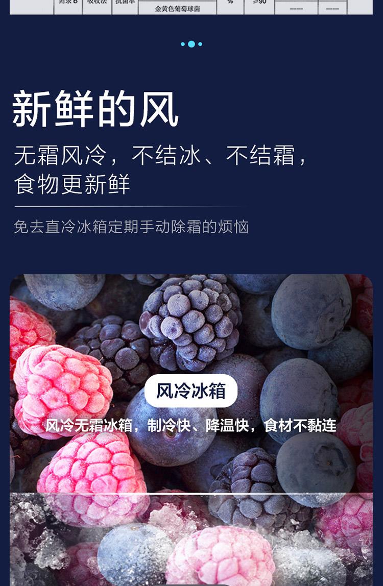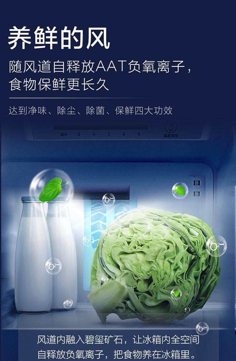 风冷无霜设计,不结冰不结霜,持久保持新鲜,冷藏和冷冻室双送风系统,360度立体循环风,温度均匀,不串味,风道内还添加了碧玺矿石和AAT负离子,可以净味、抗菌、保鲜除尘,其中抗菌率高达99.99%,冰箱内置4枚感温雷达,实时感温,保持冰箱内部温度均衡。