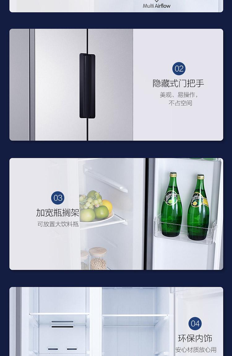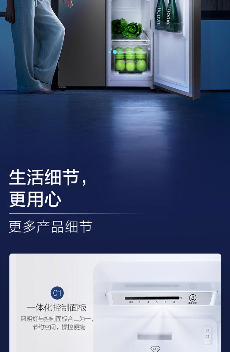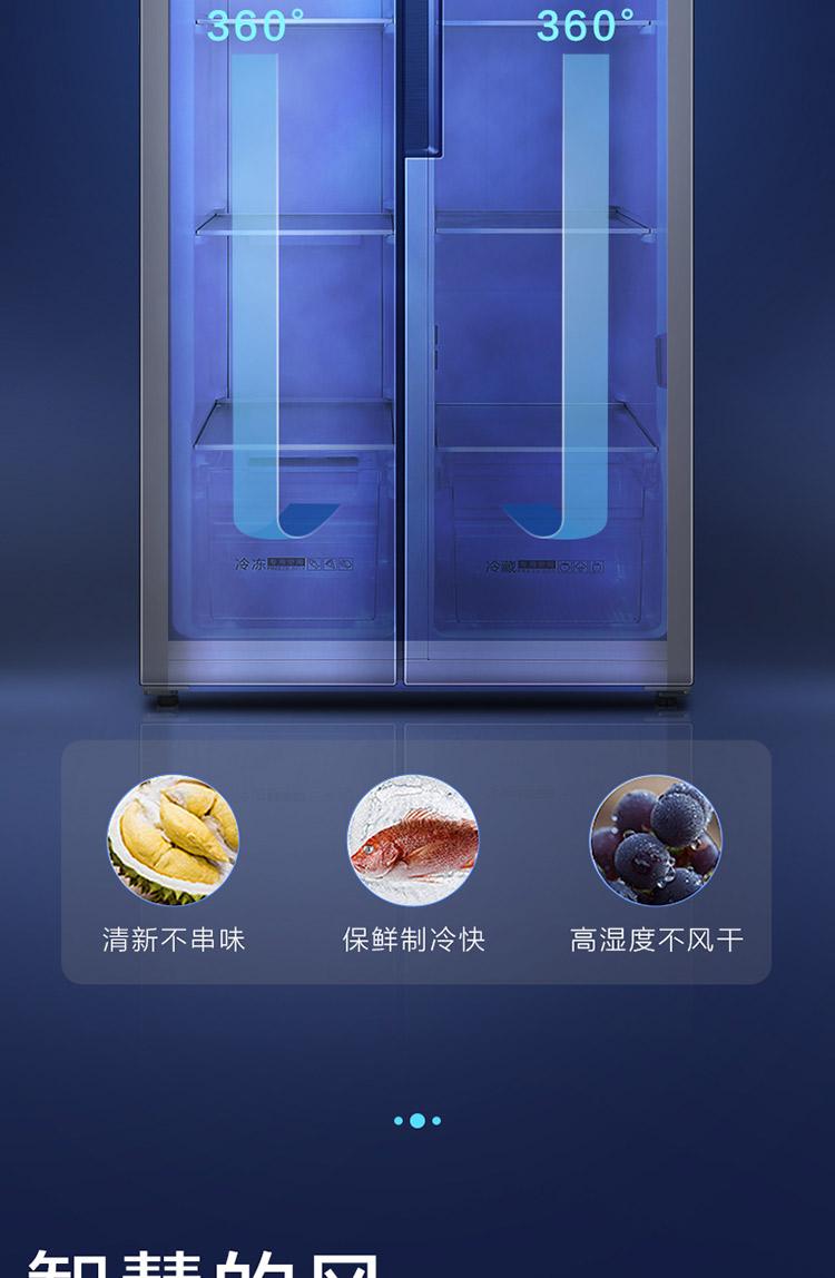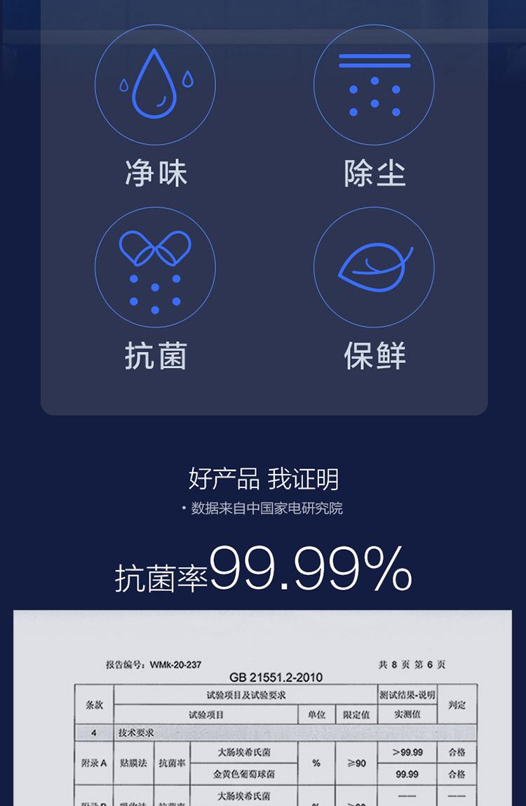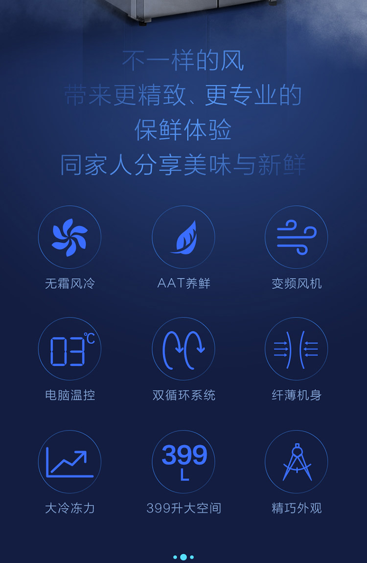 风冷无霜设计,不结冰不结霜,持久保持新鲜,冷藏和冷冻室双送风系统,360度立体循环风,温度均匀,不串味,风道内还添加了碧玺矿石和AAT负离子,可以净味、抗菌、保鲜除尘,其中抗菌率高达99.99%,冰箱内置4枚感温雷达,实时感温,保持冰箱内部温度均衡。