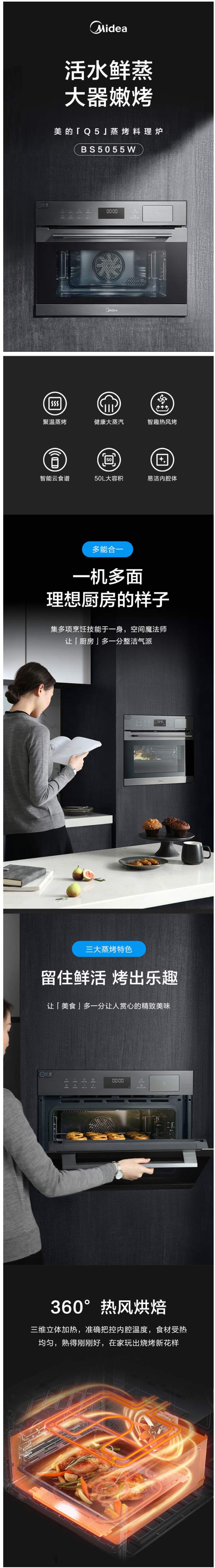 美的2020年4月新款 BS5055W 蒸烤一体机,容量50L。搪瓷腔体+隔热棉,聚温蒸烤更专业;快速产生蒸汽,包裹食物,营养流失少;搪瓷腔体,耐刮、易洁,持久耐用;上下双热源搭配背部热风对流,立体烘烤,温度均匀;APP海量菜谱,多种食谱自由选;LED+中文显示,时尚简约,一键自清洁,蒸汽清洁更省心。