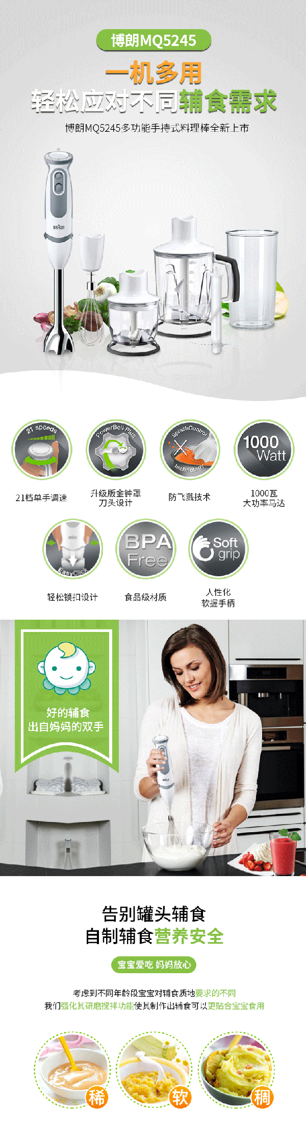 这款博朗Braun 5245多功能料理棒,是一款宝宝辅食搅拌棒,是旗下的明星款产品,可以一机多用,轻松应对不同的辅食需求。