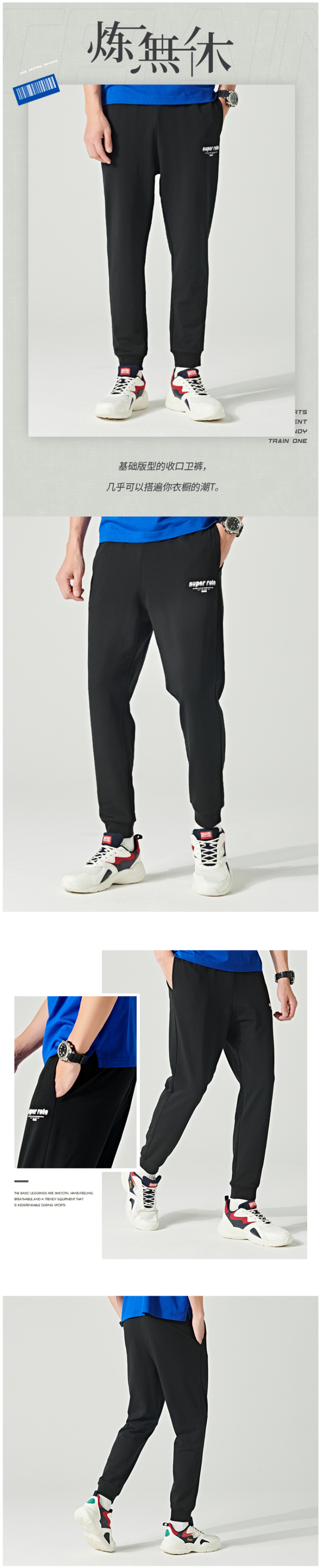 在款式上,标准版型,合体剪裁,裤脚束口,百搭适穿,弹力裤腰搭配内置抽绳,穿脱方便,休闲随性。