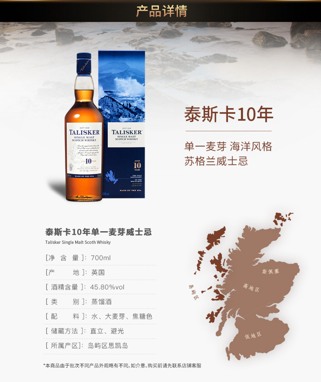 10年陈酿 单一麦芽.闻香:高辨识度的烟熏,辛辣,甘草和海藻,本酒强烈的泥煤熏香中带有海水的咸味酒液中并透出鲜牡蛎、柑橘等的甜香气息。