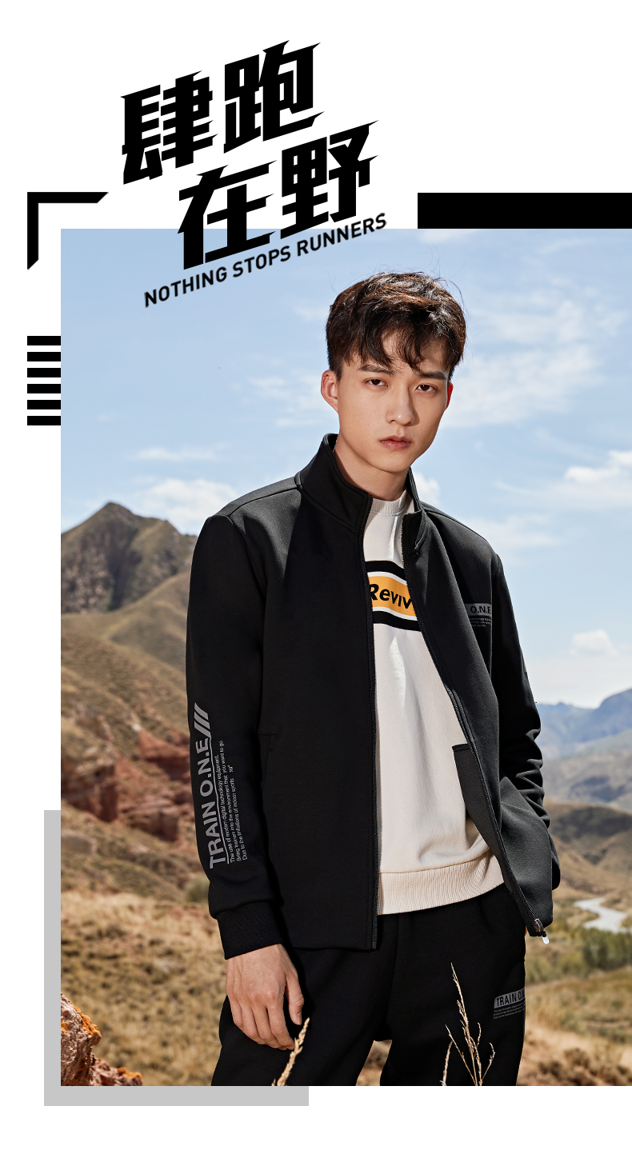 在款式上,运动外套的款式,开衫立领,面料厚度中等不加绒。衣面多处有简约印花,右袖撞色细节更具运动感;两侧口袋有拉链,罗纹下摆及袖口,舒适贴身,运动自如。