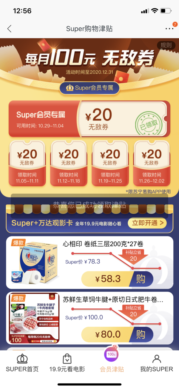 本来苏宁会员属于鸡肋,没啥用,但从上个月开始,苏宁会员每个周都会送20元的无敌券(无门槛,苏宁的绝大多数商品可用),而且一直送到12月底,等于白送200元。