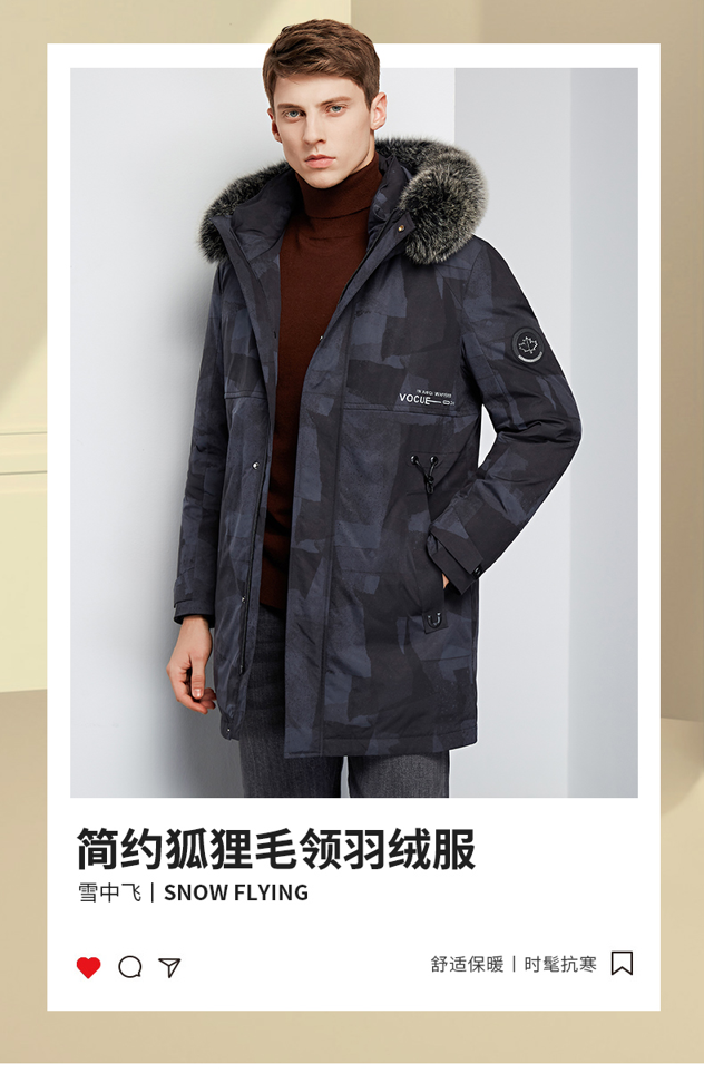 这款雪中飞羽绒服90%充绒量,甄选鸭腹部大绒朵羽毛,蓬松度高,保暖性好;且羽绒经过水洗、除尘、灭菌三大工序,干净卫生。高支高密面料配合德国防绒针,防风防泼水,有效防止钻绒。