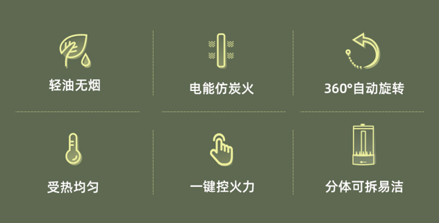 利用电能红外线,模拟炭火烧烤效果,短时间内达到烧烤温度,烤制外酥内嫩。可根据自身爱好,选择火力大小,实现各种DIY。无烟不呛人,操作方便,居家必备。