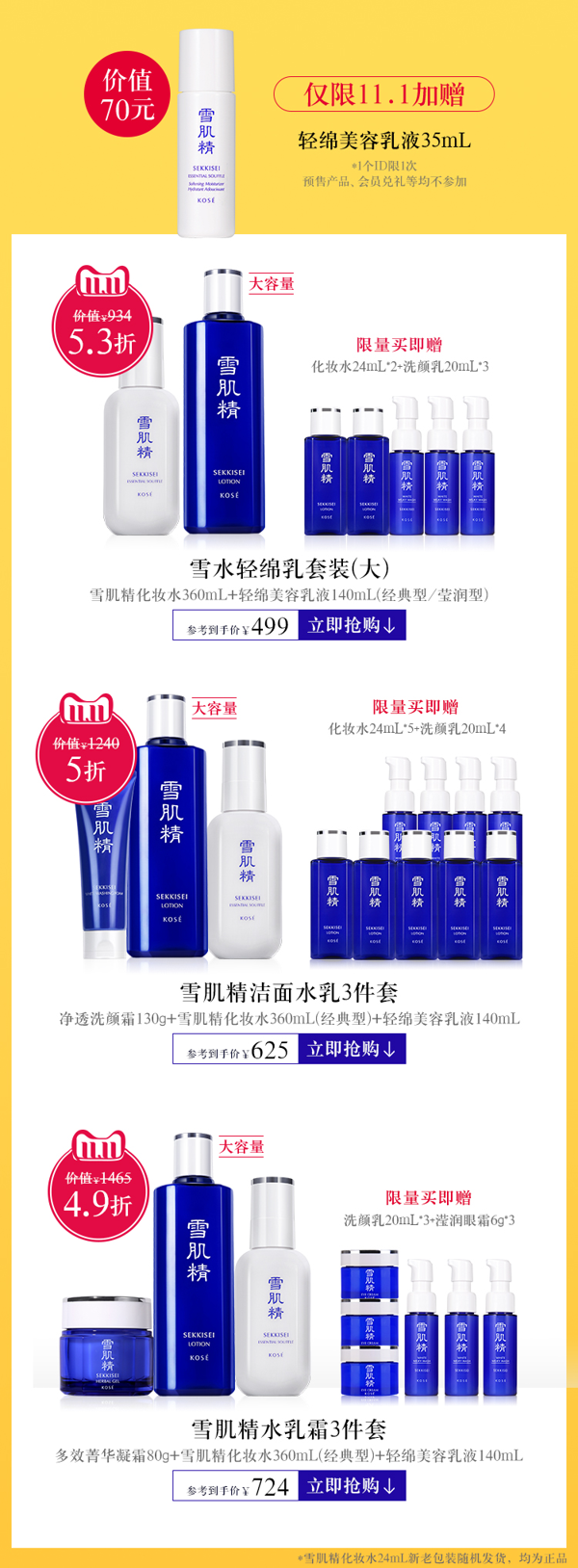 天猫雪肌精官方旗舰店,11月1-3日双11抢先购¥599元 抢先价,-50元优惠券,+1元凑单品-80元 (每满300减40元)跨店满减,=469元 到手价,大套360ml大水+轻绵乳此价。高丝 雪肌精化妆水,是最受MM欢迎的,也是KOSE高丝最引以为傲的王牌产品,具有卓越的卓越的美白与保湿效果,富含薏苡仁、当归、甘草等汉方植物精华,防止由于日晒所形成的黑斑雀斑,能改善面部粉刺、皮肤粗糙,让肌肤逐渐如雪般白皙。