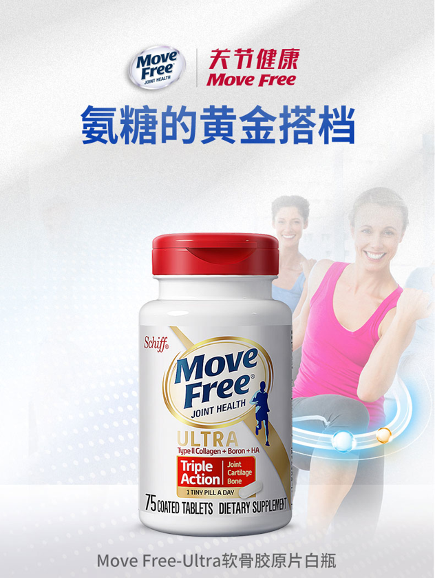 Move Free系列中除了大家熟悉的红、绿、蓝三种普通款,还有这款Move Free Ultra,更新了新配方,不过主要配方和含量都没有变化。能保护关节,减轻关节磨损,修复流失软骨的重要成分,关节部位有较轻微病症的人群可以考虑服用。