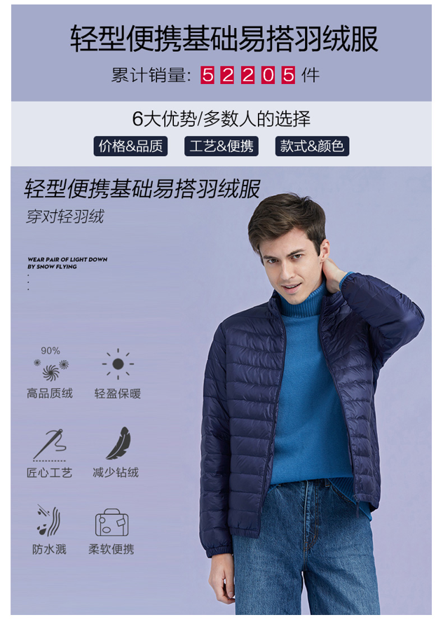 多款可选,雪中飞官方旗舰店,品质有保障。这款雪中飞羽绒服,修身轻薄款式,适合春秋比较冷和冬季不太冷时穿,选用高品质的大朵绒白鸭绒,不含杂质,含绒量高达90%,充绒量不到100g,轻暖无压迫感。大身是高密尼龙面料,舒适透气,防钻绒、防泼水,耐脏易清洗。附赠收纳袋,出行轻松携带,实用方便。