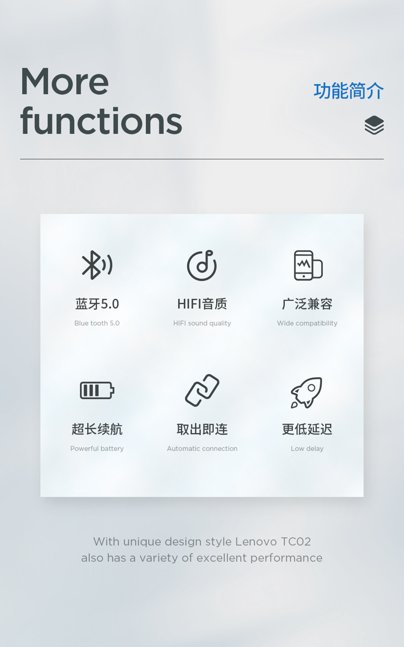 联想TC02蓝牙5.0耳机,支持单双耳,可分别连接2各不同的设备,智能触控工艺,手指轻触即可操控,纳米防水,防水防汗狂甩不掉,仅3.6g超轻佩戴,配备3种大小的耳塞,佩戴非常舒适。大容量聚合物电池,16小时超长时间续航,无限畅听可刷8部电影。