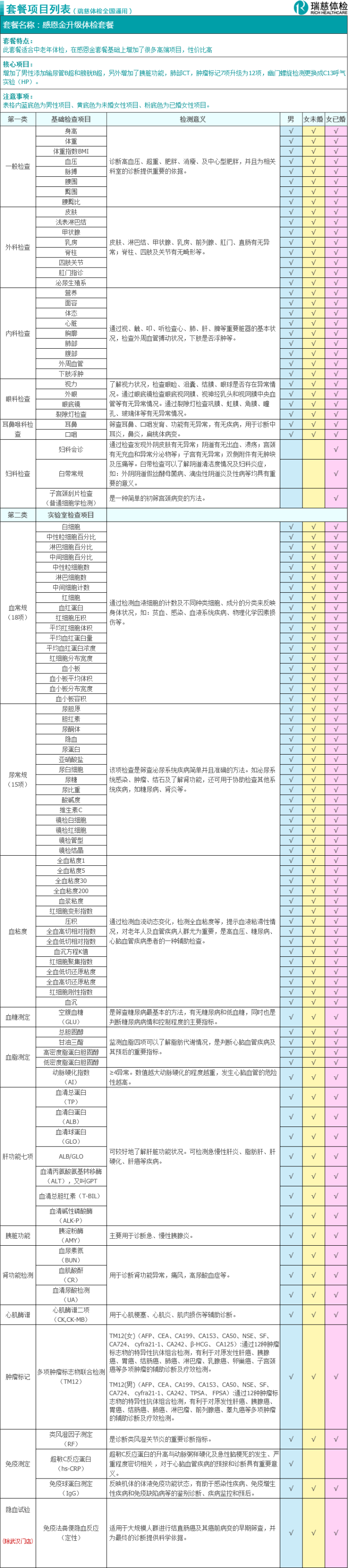=1015元 到手价,这款是瑞慈的高端体检套餐,各项检测项目都做了不小的升级,血液、尿液等体液测试也比一般的套餐全面,血测中有类风湿因子、超敏C和免疫球蛋白的免疫测定,还有12项肿瘤标志物的测定,能对多项肿瘤有辅助性的诊断。
