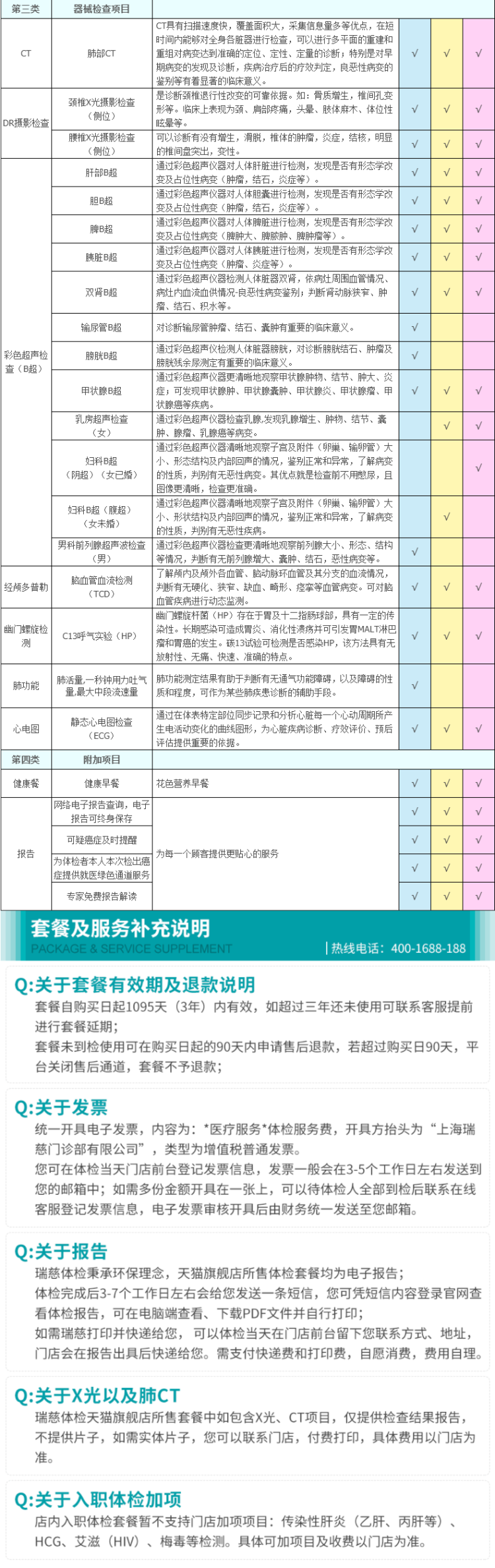器械项目中,增加了肺部的CT、颈椎和腰椎的X光片,以及近乎全部器官的彩色B超检查,项目非常全,这个价格相比于一般的体检,性价比也非常高。