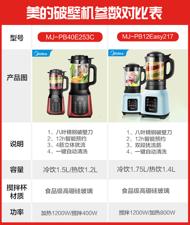 搅拌杯是加厚高硼硅玻璃制成,结构更牢固不易碎,耐高温骤冷骤热不易炸裂,可冷热双打。IMD操作界面,带12小时提前预约功能,制作完成后自动保温4小时,非常贴心。有一键清洗功能,清洗方便不留异味。在安全方面,防烫防滑手柄、开盖断电保护、中空进料孔、防烫杯盖。