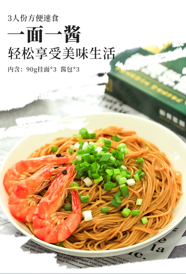 每盒里包含有挂面90g*3袋+料包35g*3袋,超香die。罗永浩推荐,3人份方便速食,一面一酱,面条弹韧度好,口感劲道,不粘不坨,鲜香醇厚,方便速食。