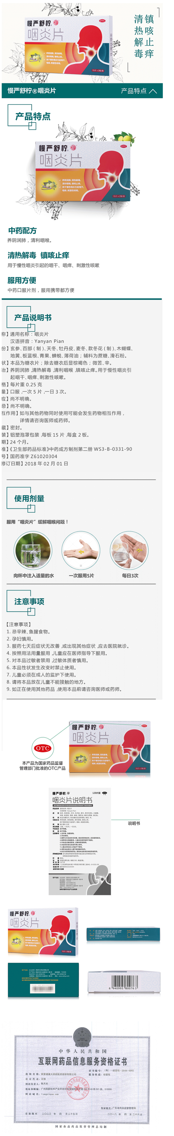 这款慢严舒柠 咽炎片,是咽炎患者的首选药物之一,具有养阴润肺,清热解毒,清利咽喉,镇咳止痒的作用,可以大大缓解咽喉部不适,适用于咽喉干痒、肿痛、异物感、干咳干呕、声音嘶哑、吞咽困难等慢性咽炎症状。