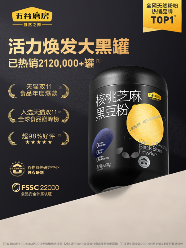 配方超强升级,核心成分来自云南的核桃仁>10%、鄱阳湖黑芝麻>23%、东北黑土地黑大豆>29%,特别添加了墨西哥奇亚籽、黑藜麦、黑米、山药等。