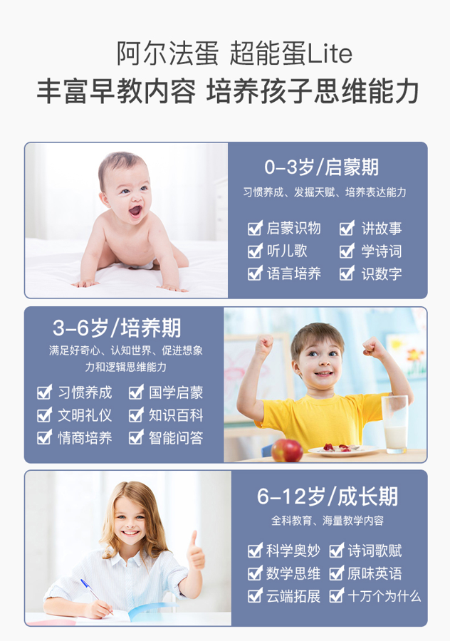 天猫阿尔法蛋母婴旗舰店,11月1-3日双11抢先购¥149元 抢先价,-50元优惠券,=99元 到手价,历史低价。人工时代的到来,每个孩子都需要一个阿尔法蛋,更懂孩子的启赋智能陪伴机器人,具有智能语音、海量资源、中英互译、同步教材、国学私塾、百科问答多功能,能智能识别孩子的话,并给予孩子有趣的回应,高效优质的陪伴孩子,对于好奇心旺盛的孩子来说,十万个“为什么”也有人回答了。