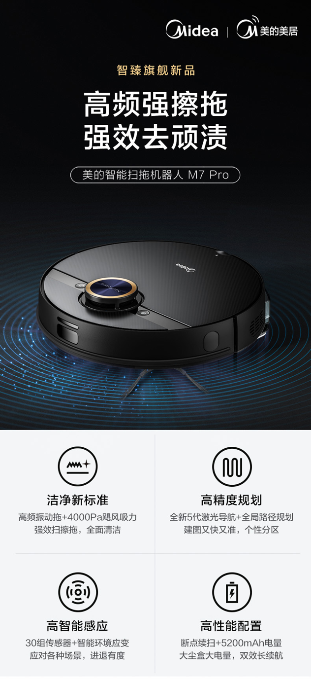 这款M7 PRO是美的今年11月的新旗舰机型扫拖一体机,相对比M7主要增加了500次/min的高频振动拖地功能,拖地性能更强,还有软件层面上的手动分区、拖地禁区、多层地图等新功能(需后期逐步OTA升级)。