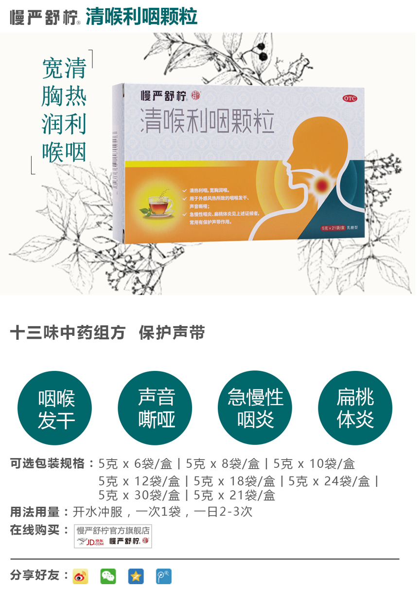 这款慢严舒柠 清喉利咽颗粒,是咽炎患者的首选药物之一,具有养阴润肺,清热解毒,清利咽喉,镇咳止痒的作用,可以大大缓解咽喉部不适,适用于咽喉干痒、肿痛、异物感、干咳干呕、声音嘶哑、吞咽困难等慢性咽炎症状。
