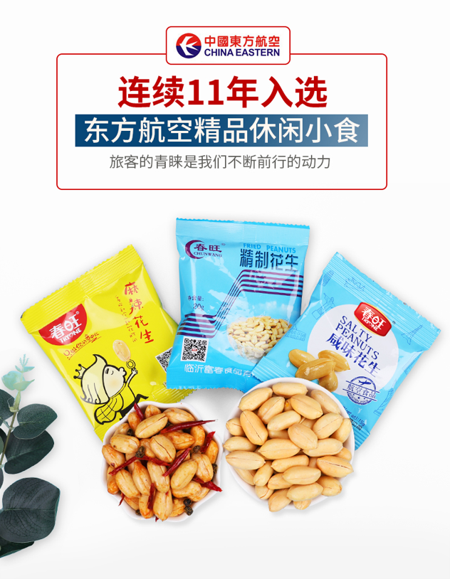 “春旺”是临沂富春食品有限公司旗下品牌,成立于2001年12月,是一个专业生产咸味花生及其他果仁制品的休闲果仁食品企业, 是美国绅士坚果、麦德龙..指定供应商,同时也是中国东方航空,山东航空公司,中国南方航空等6家航空公司食品指定供应商,产品远销全球30多个国家,深受广大经销商和消费者的喜爱。