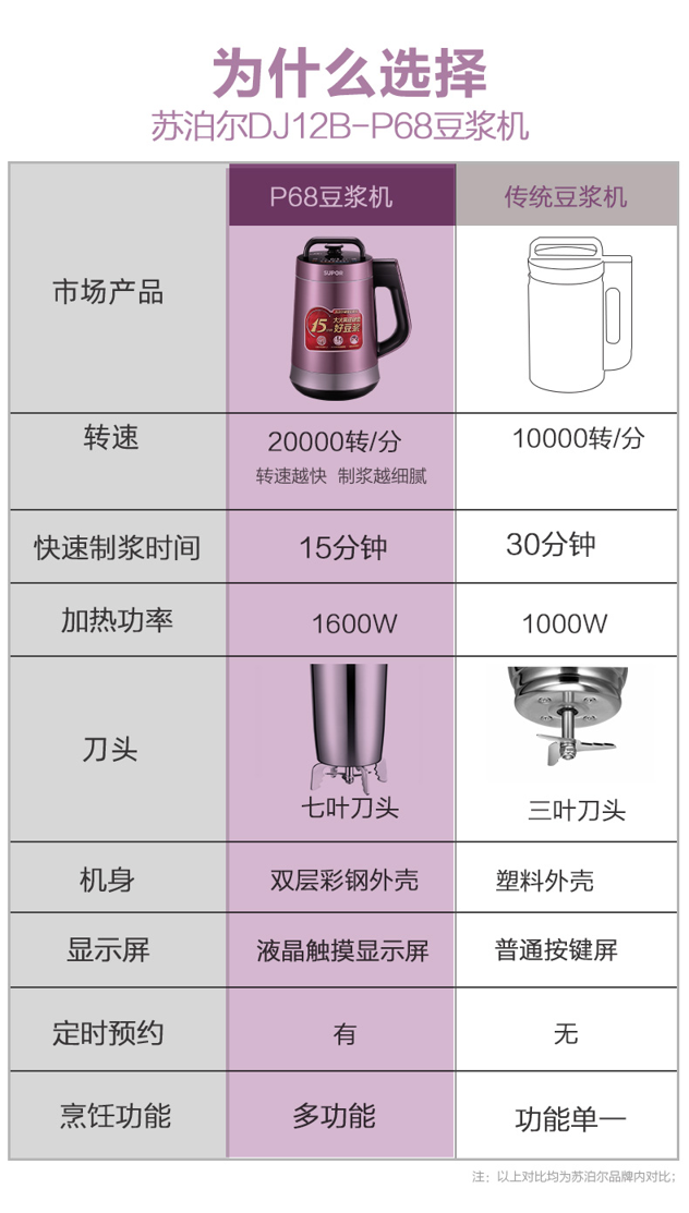 拥有智能熬煮程序,针对不同食材,采用不同的研磨时间、力度、熬煮时间、温度等,都有非常科学的规范,达到充分释放不同食材的营养;底侧立体加热,豆浆在制作过程中不糊底。