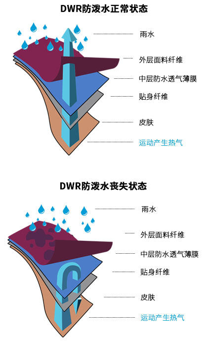 DWR是“Durable water repellent/持久拒水性”的简称,作为涂层,DWR仅疏水,作为防水功能的补充,在持久的雨水和施加压力下,水依然会渗入到内里,只有DWR涂层不能说防水。