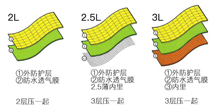▲Gore-Tex是压合布料,薄膜外层是坚固的尼龙表布,里面也有防护内里,将“外防护层 Gore-Tex膜 内里”这压在一起,形成防水透气三层布结构。现今所有的防水防风功能面料,都是多层夹膜结构,传统3L防护性最强,为追求轻便、透气、性价比,后面也出现2L与2.5L结构面料。