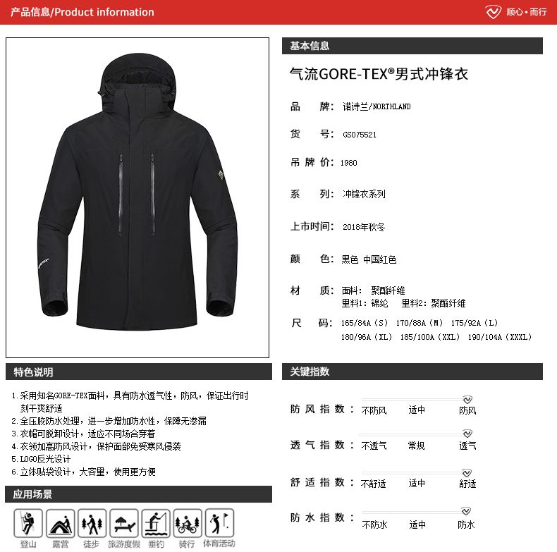 这款诺诗兰冲锋衣采用Gore-tex面料,并做了接缝全压胶处理,能做到极致的防风防水,且保持良好透气性,穿着舒适;内里为抓绒内胆,保暖性优异,且不易起球起静电,提高穿着舒适度。修身合体版型,上身不臃肿,标配日本YKK拉链,经久耐用。简约纯色款式,不论户外旅行、休闲通勤等,都适合穿着。