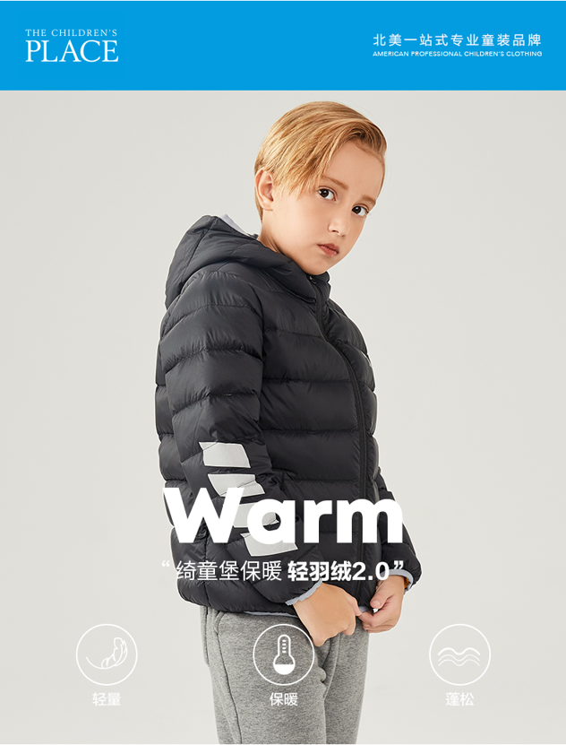 2款多色选,100-160cm码齐全。北美童装TOP品牌,2020新款,90白鸭绒充填,时尚连帽防风保暖,穿上轻羽绒,随时轻运动。