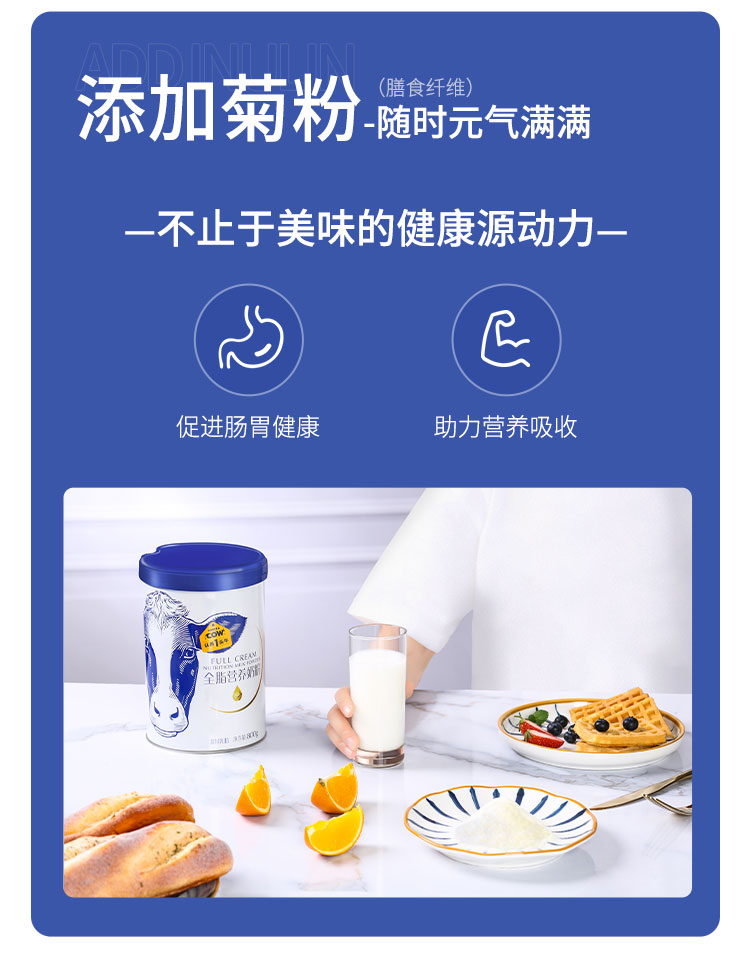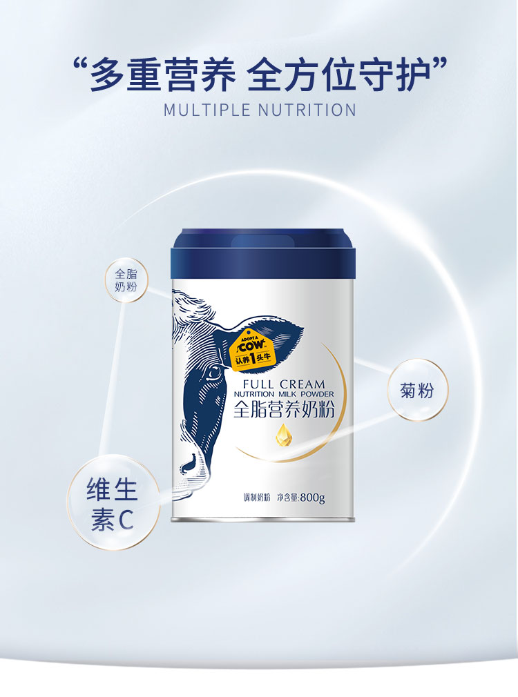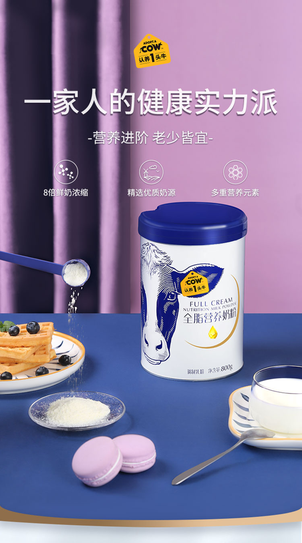 这款 认养一头牛 营养全脂奶粉,规格: 800g,优质荷斯坦纯种奶牛,8倍鲜奶浓缩,入口香浓纯正,口感甜美,三效降膜浓缩,减少营养损失,特别添加菊粉成分,助力肠胃健康。