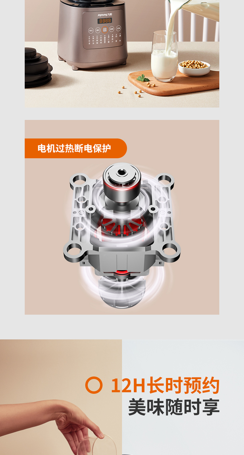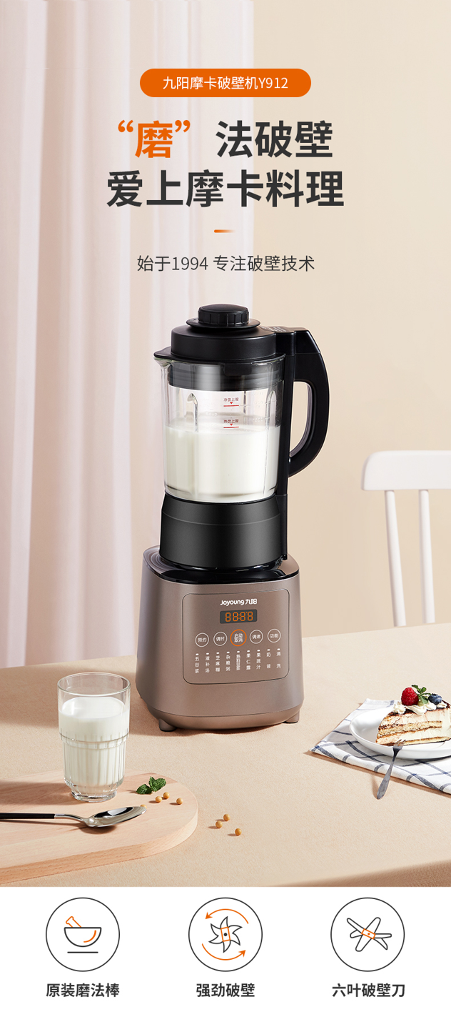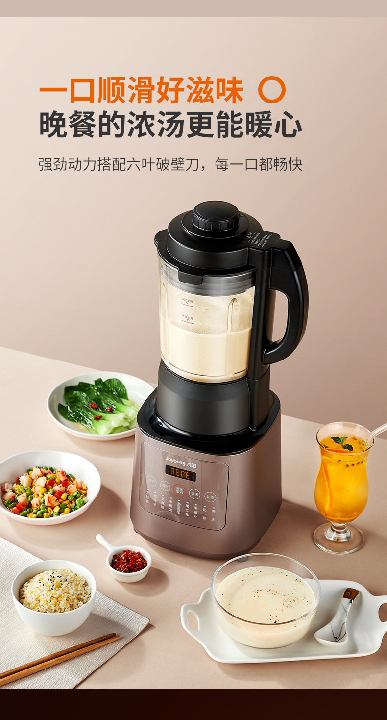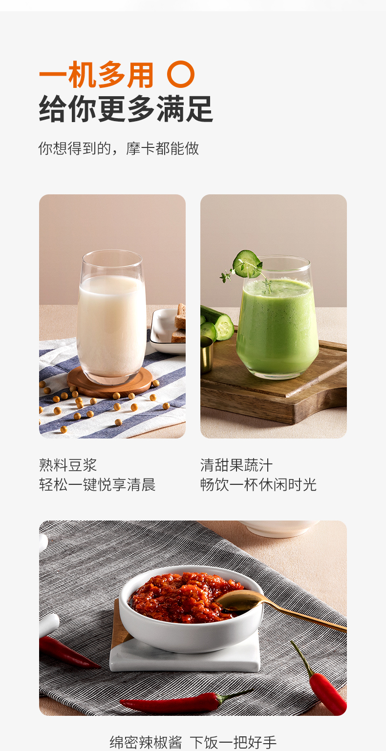 九阳的这款破壁料理机,集合了集料理机、豆浆机、咖啡机、绞肉机、辅食机、沙冰机、果汁机等产品功能,可用来做豆浆、米糊、五谷汁、玉米汁、果蔬汁、沙冰,甚至能将整条鱼、排骨等,直接打成细腻骨汤,完全达到一机多用功能。