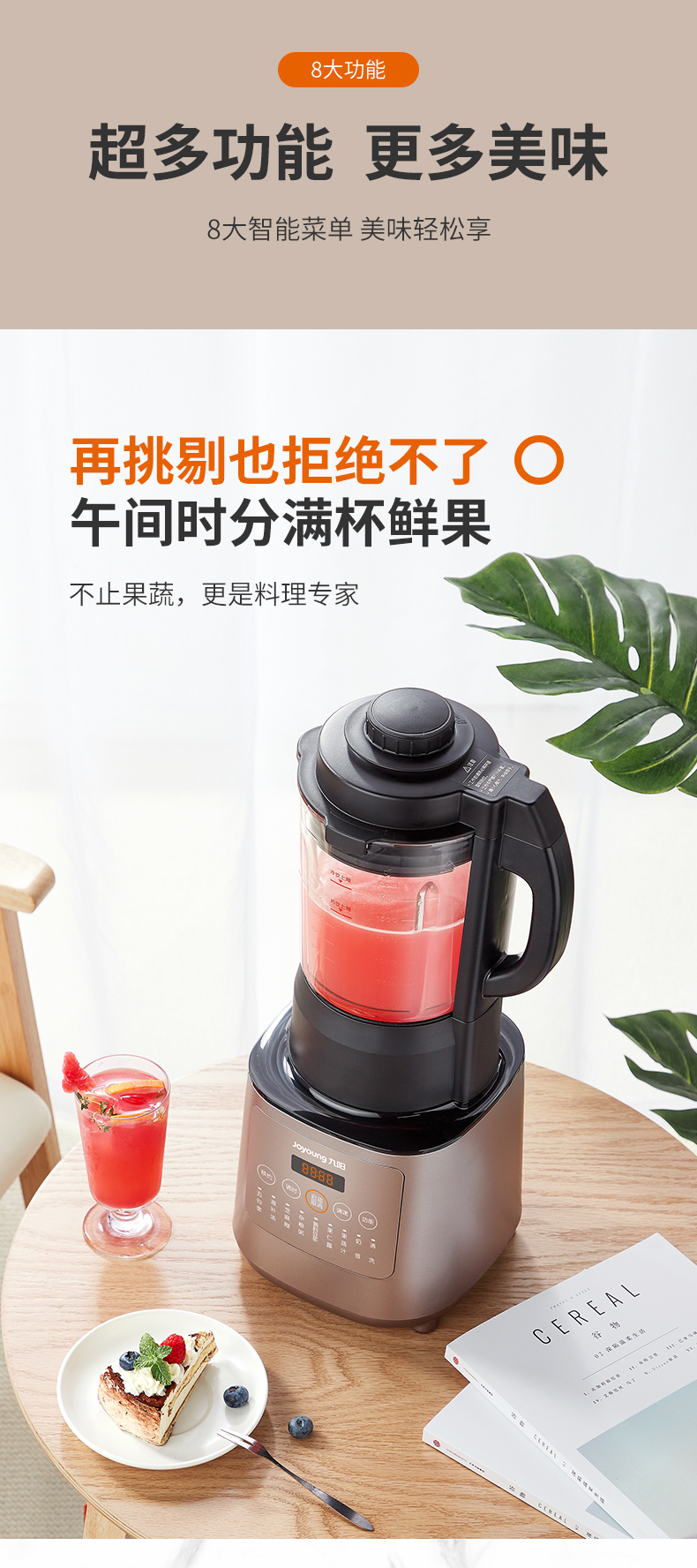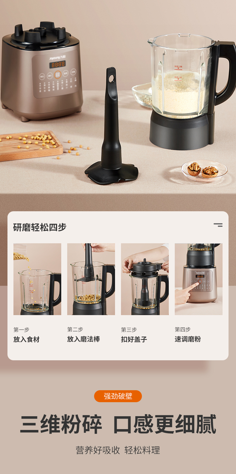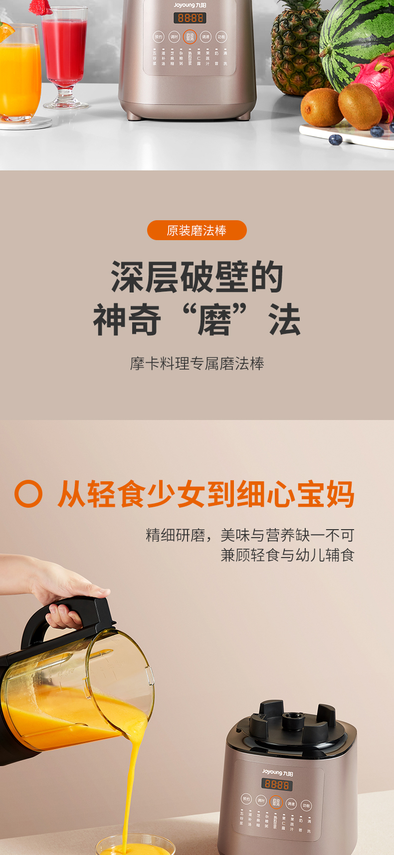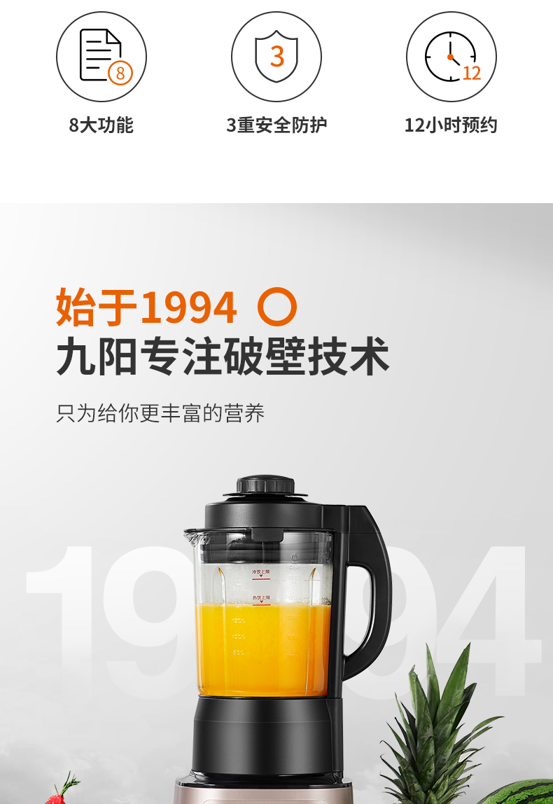 九阳的这款破壁料理机,集合了集料理机、豆浆机、咖啡机、绞肉机、辅食机、沙冰机、果汁机等产品功能,可用来做豆浆、米糊、五谷汁、玉米汁、果蔬汁、沙冰,甚至能将整条鱼、排骨等,直接打成细腻骨汤,完全达到一机多用功能。