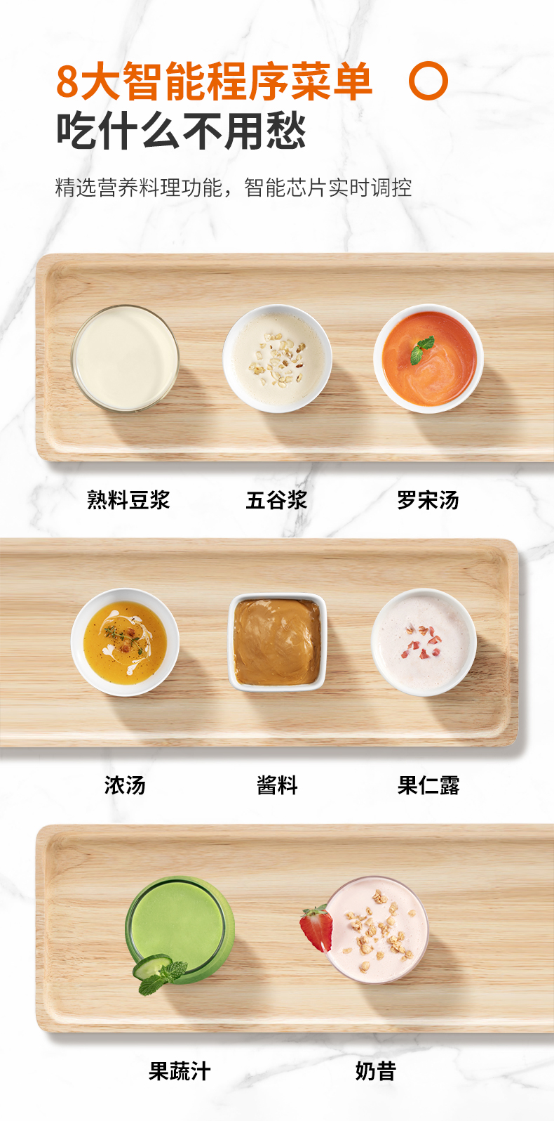 智能触摸面板,屏幕大清晰,高敏电容屏,反应灵敏,有12个按键菜单,分别是调速、调时、启动/取消、预约、调温、浓汤、五谷浆、滋补糊、养生粥、果蔬汁、酱料、点动/清洗。
