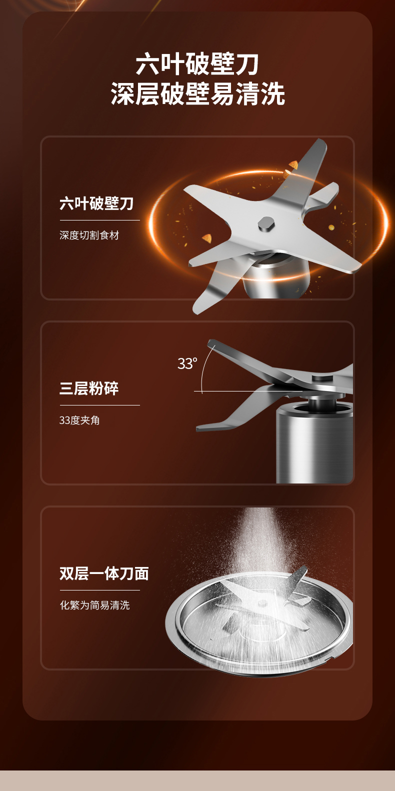 上层四叶,打磨、搅拌、破壁,立体粉碎食材研磨细腻;