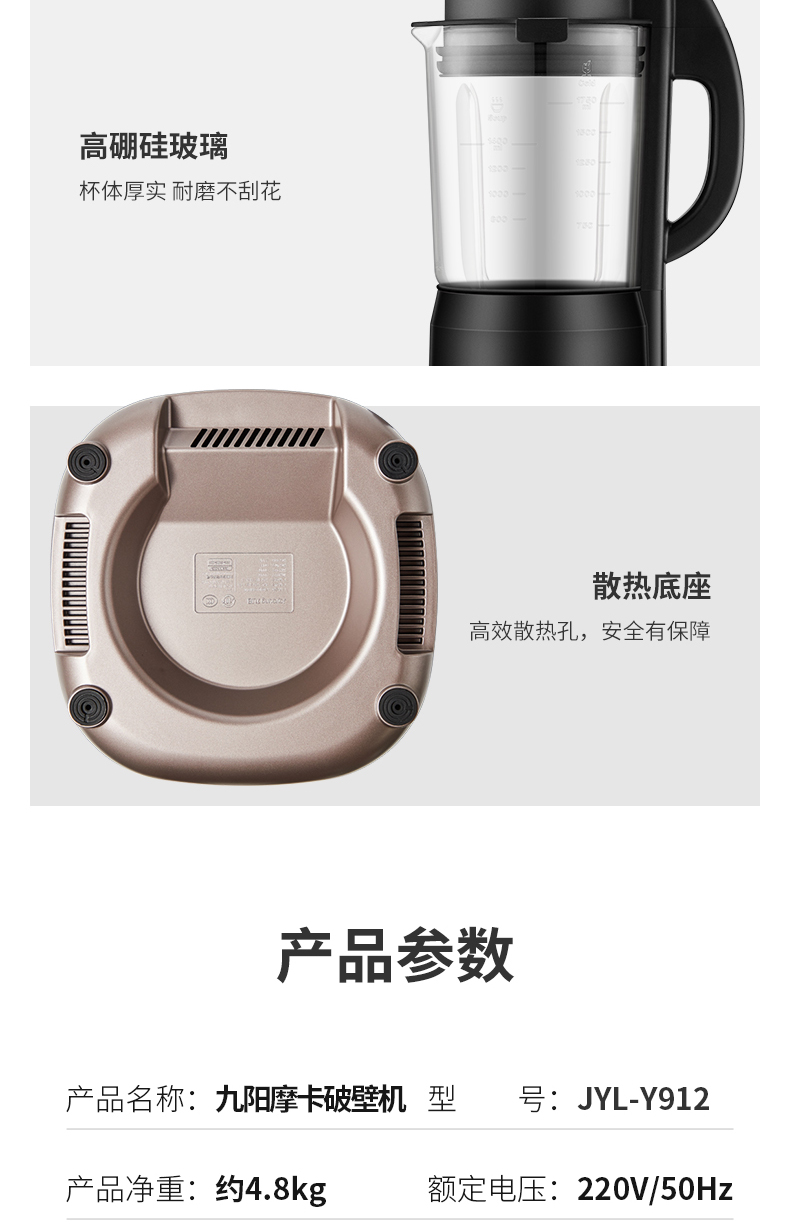 搅拌杯是加厚高硼硅玻璃制成,热饮上限1400ml、冷饮限1750ml,耐受200℃温差骤变不破裂,高强度耐震动,结构更牢固不易碎,破壁效果更佳;金属材质的需要担心是不是304不锈钢,不是304的会有重金属析出。