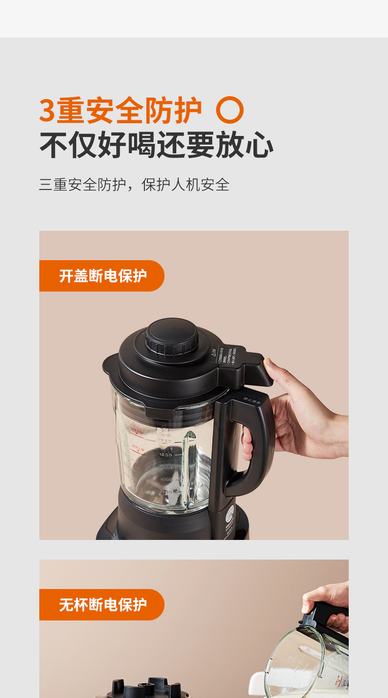 在安全方面,防烫防滑手柄、开盖断电保护、中空进料孔、防烫杯盖。