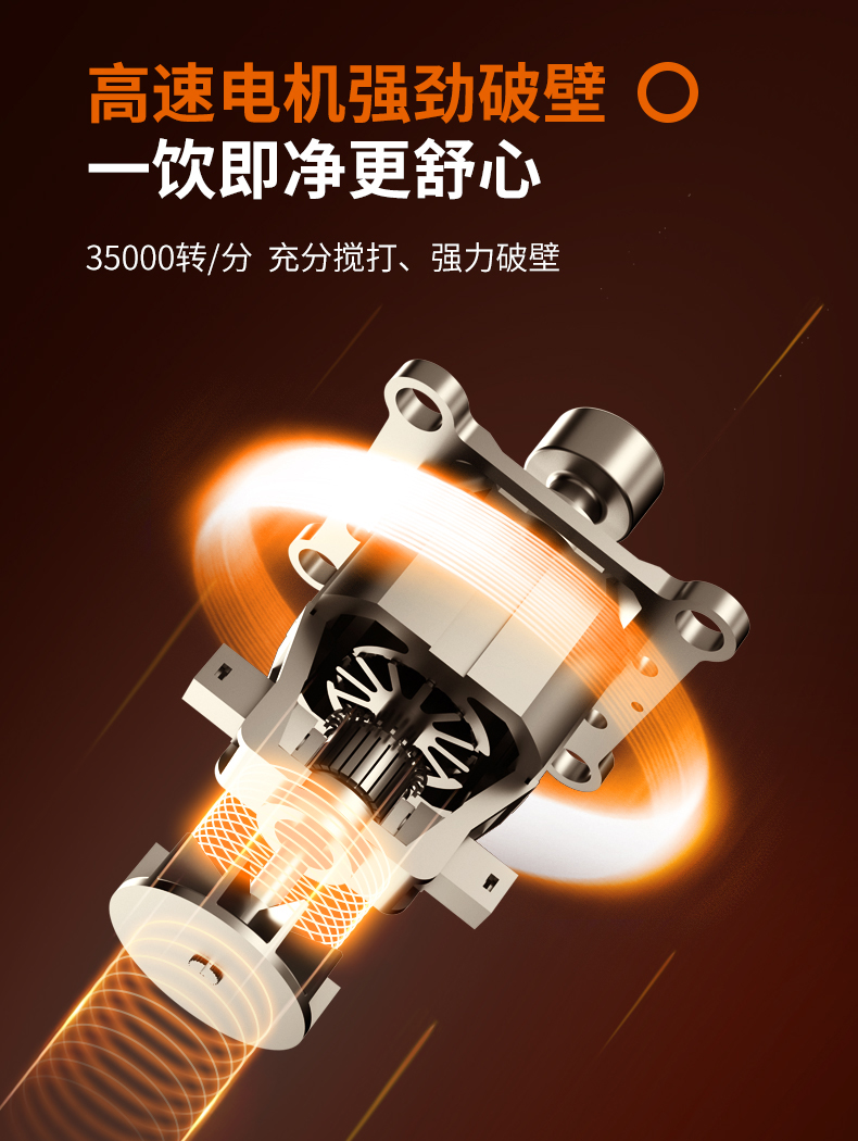1100W的功率,35000转/分钟,搭配两层立体六叶旋转刀片,360°立体旋风切割,增加食物和刀片的接触次数,更高效的打破细胞壁;4D扰流筋立体扰流,形成们猛烈的撞击形成立体旋涡使食物瞬间破壁,让水分及营养全部被释放,如维生素、膳食纤维、微量元素、花青素、植物素等,可以更好的被吸收,同时研磨后口感更细腻。