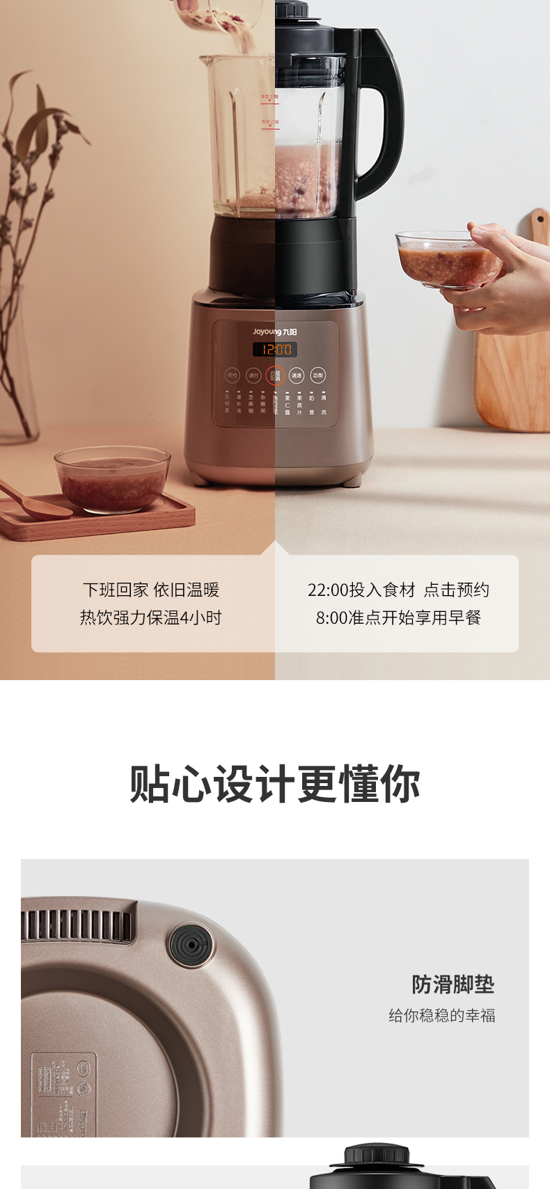 除了能瞬间击破蔬果的细胞壁,还能直接加热;3D立体搅拌加热,360°立体循环加热,受热面积更大,热效率更高,边熬煮边搅拌,食材受热均匀,充分乳化口感更浓郁,有效保留营养;智能防溢探头,降低了糊底的可能性,熬煮不溢出。