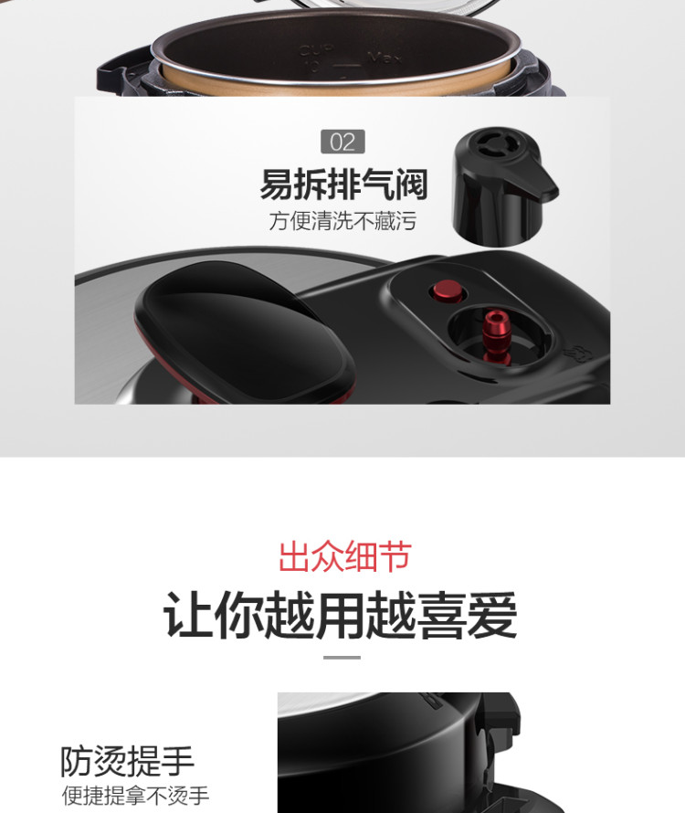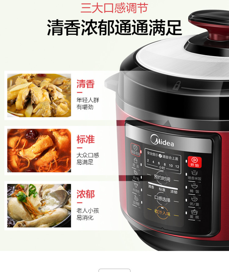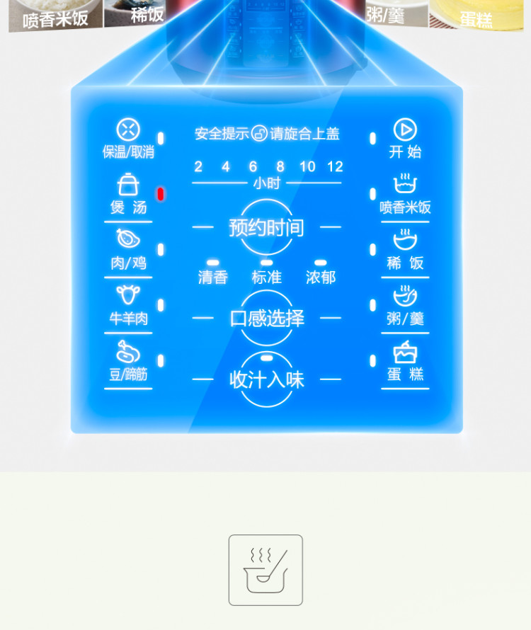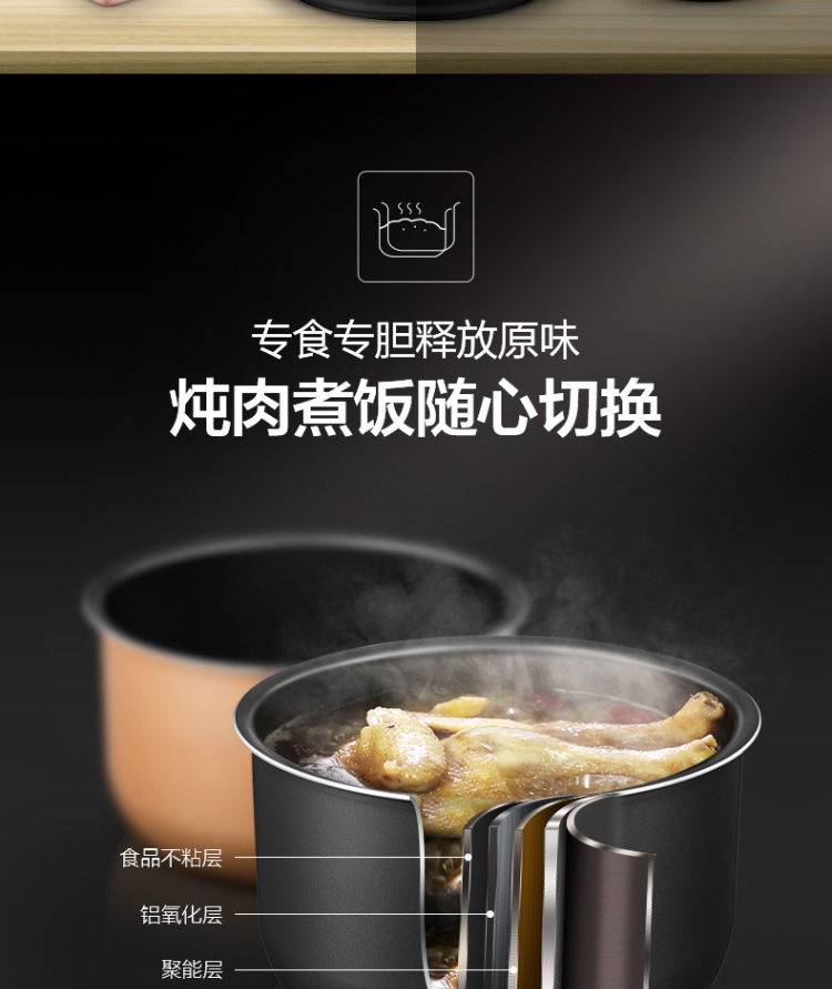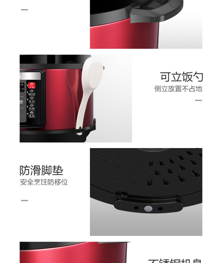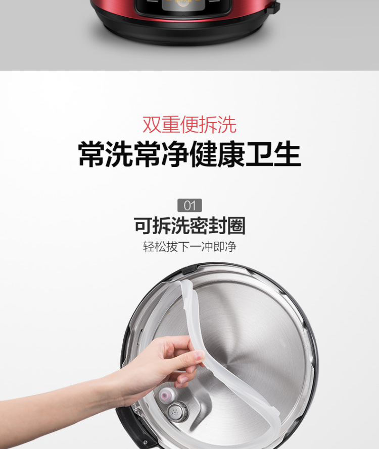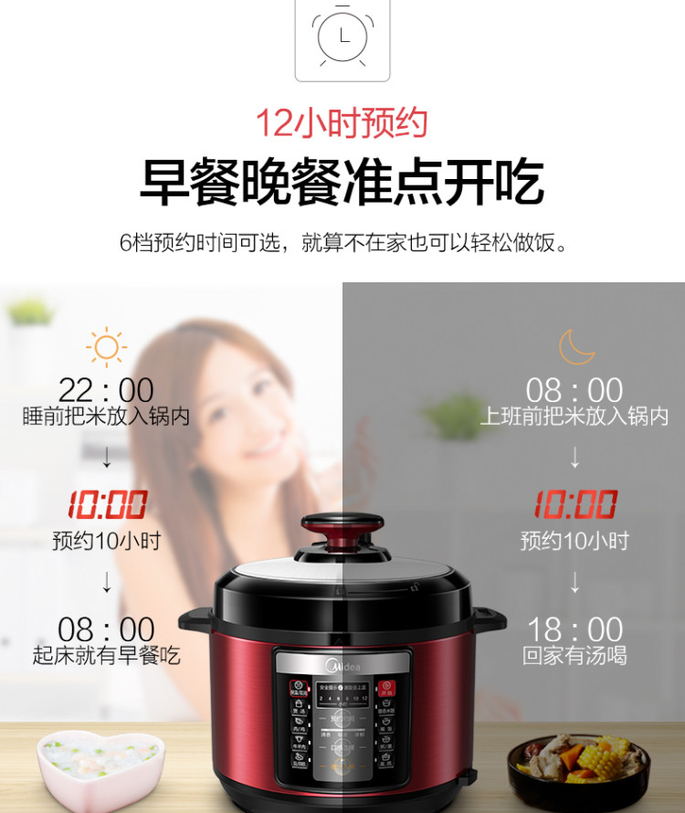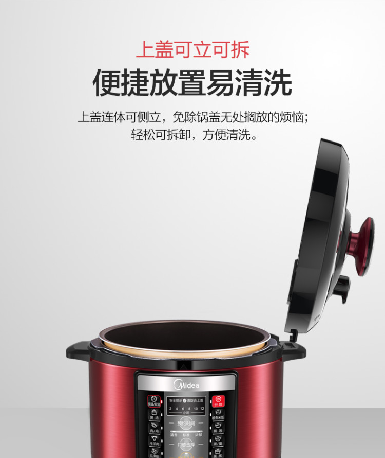 具备24小时智能预约、双智能安全检测功能,上盖可拆卸,清洗方便。全金属机身,无锅沿设计。
