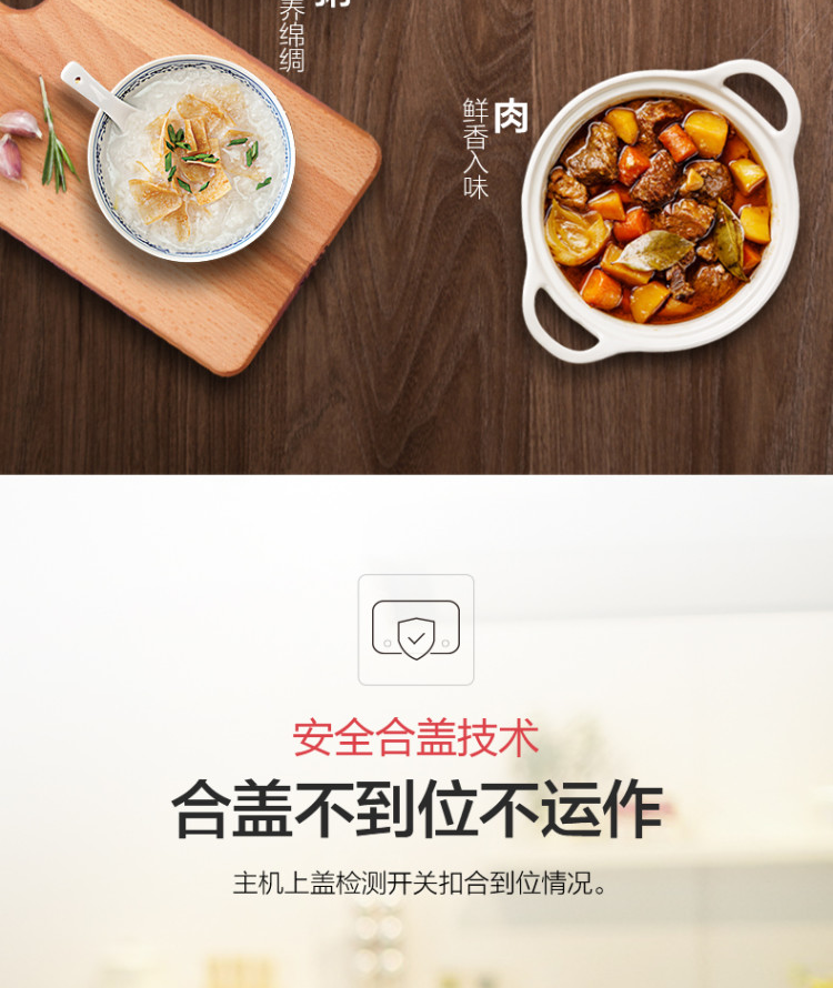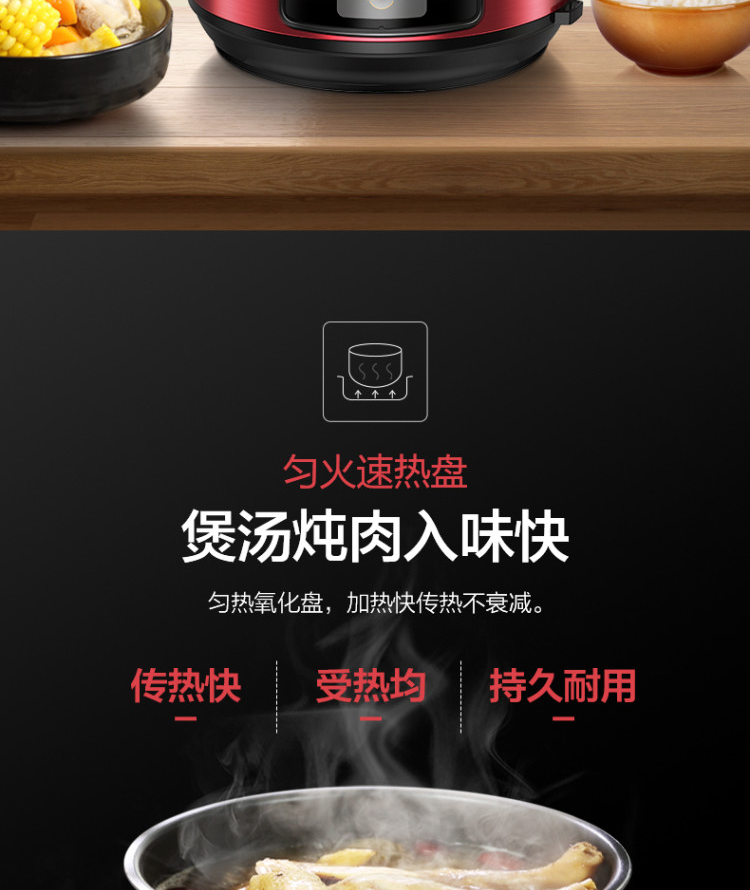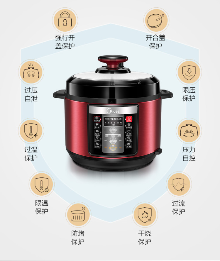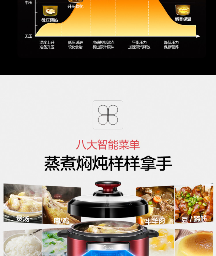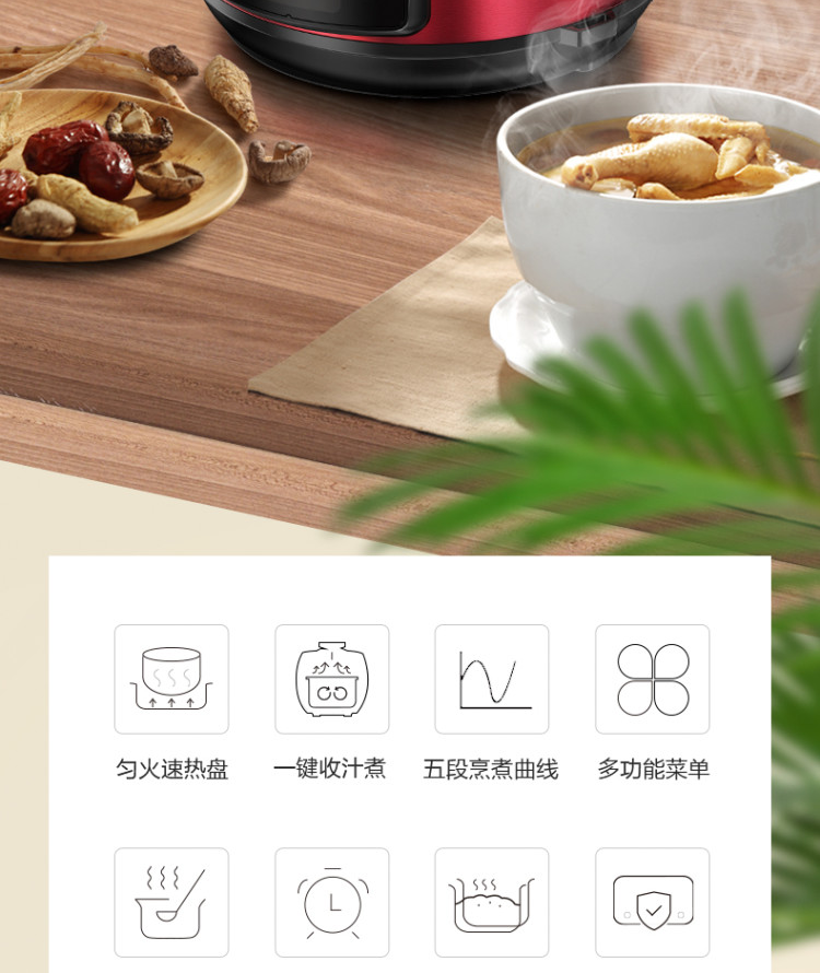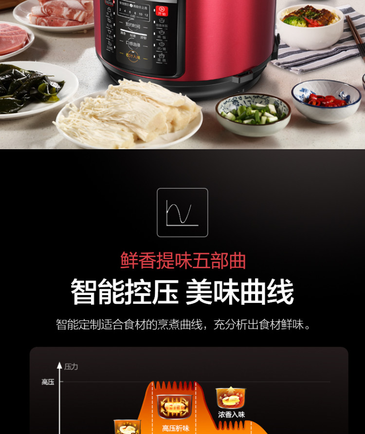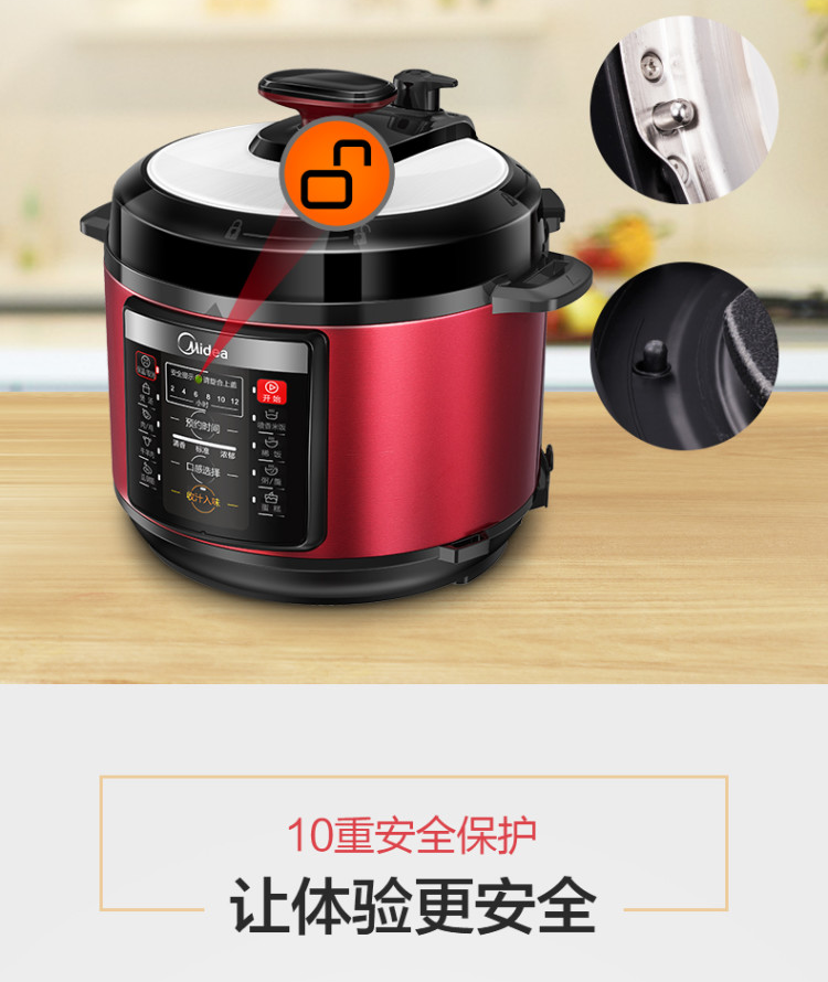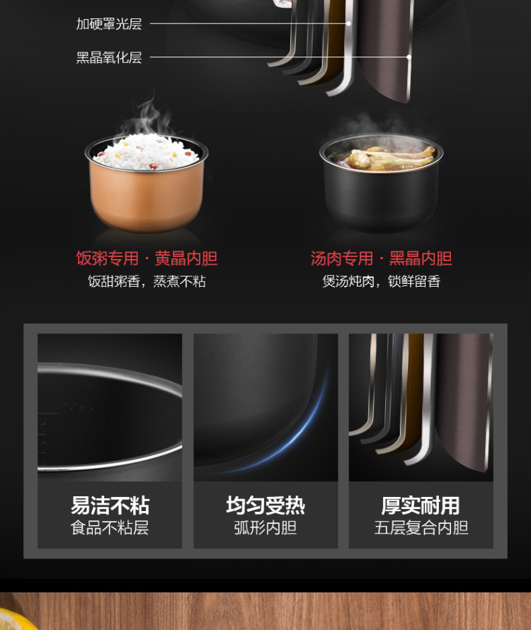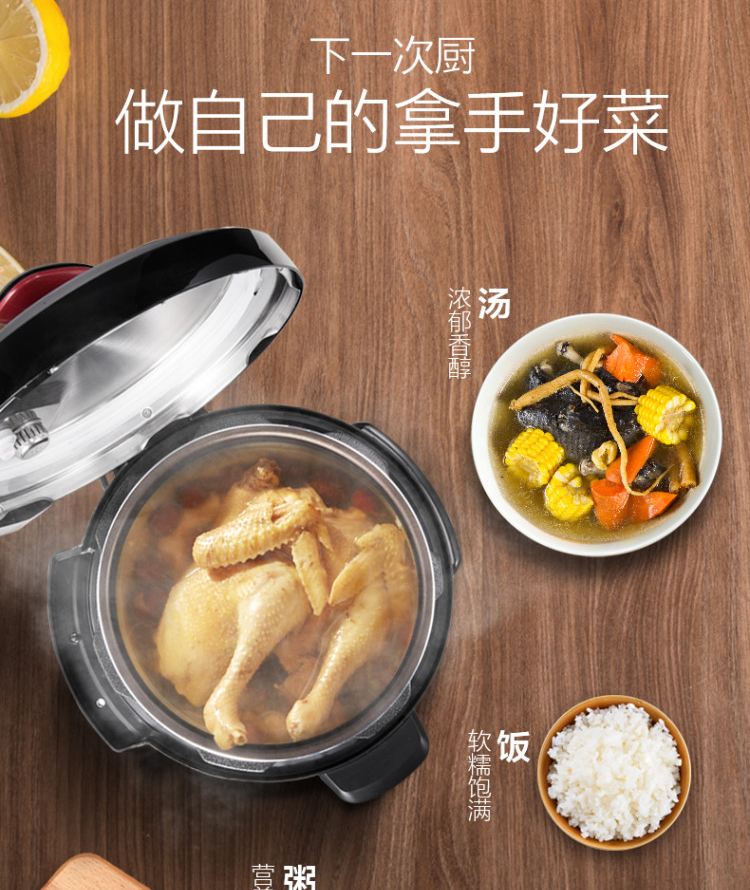 具备24小时智能预约、双智能安全检测功能,上盖可拆卸,清洗方便。全金属机身,无锅沿设计。
