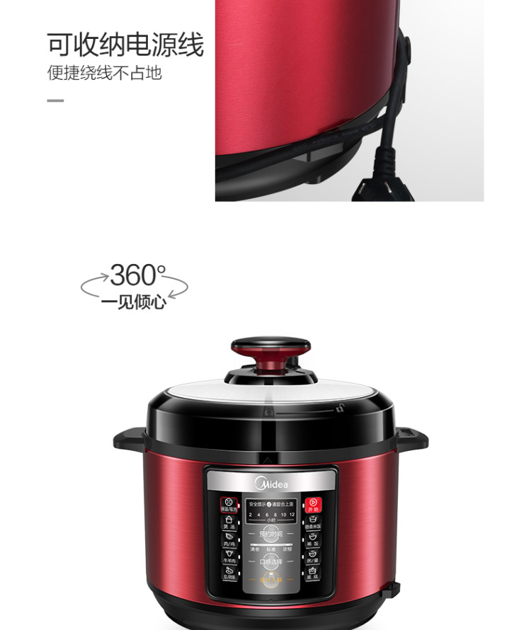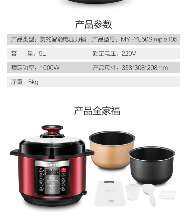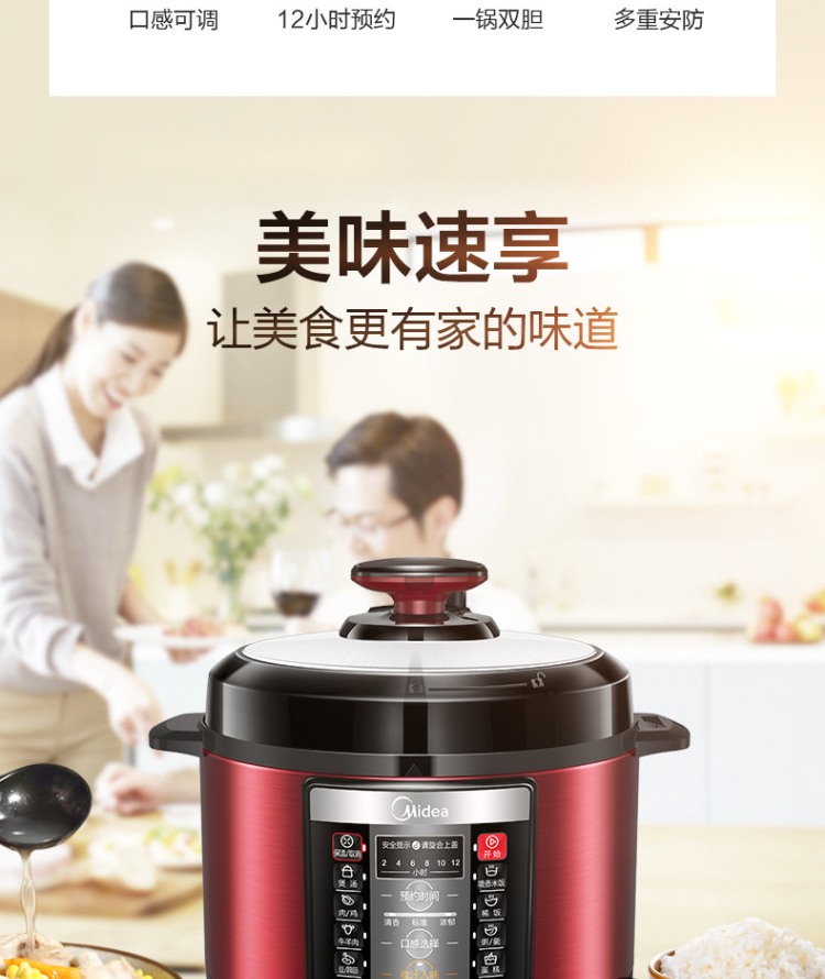 美的智能电饭锅,容量为5L,一锅双胆, 清淡、油腻食材分开烹饪,有效避免串味。 拥有8大功能菜单,24小时预约定时,可拆洗上盖板,一键排压,使用方便、省心。