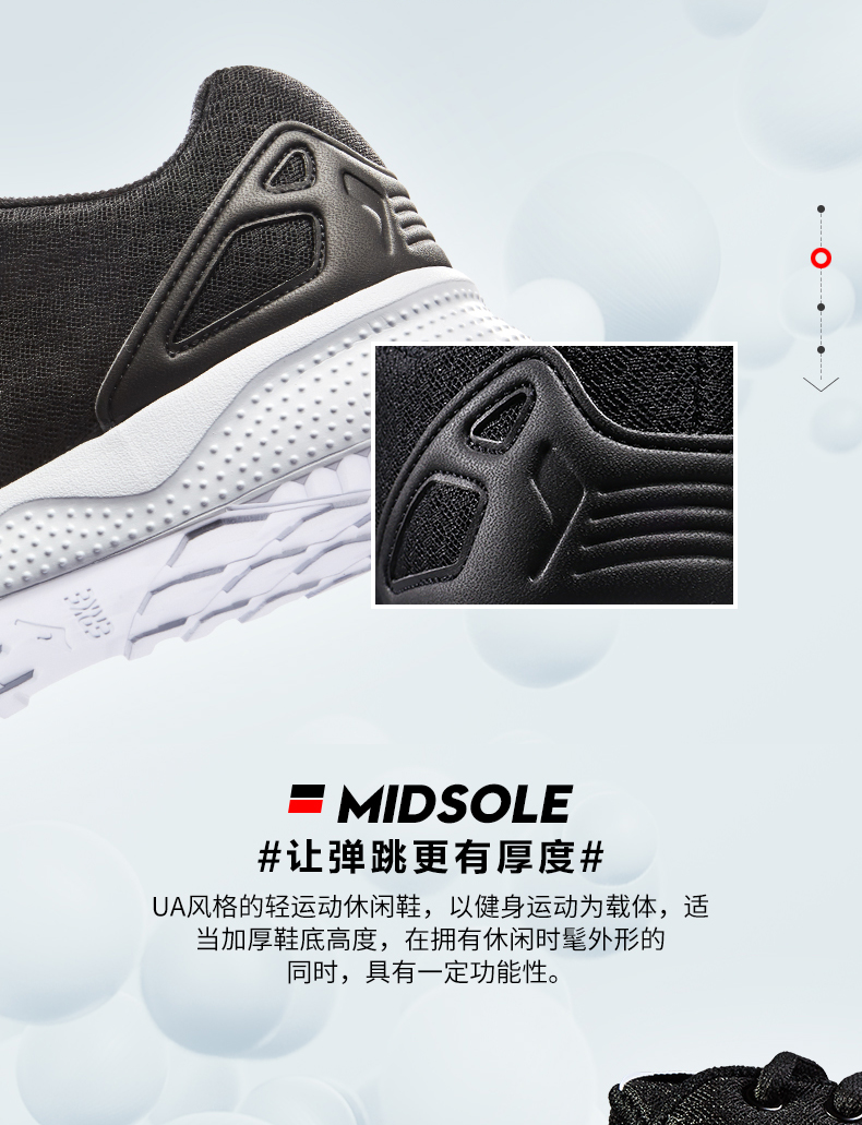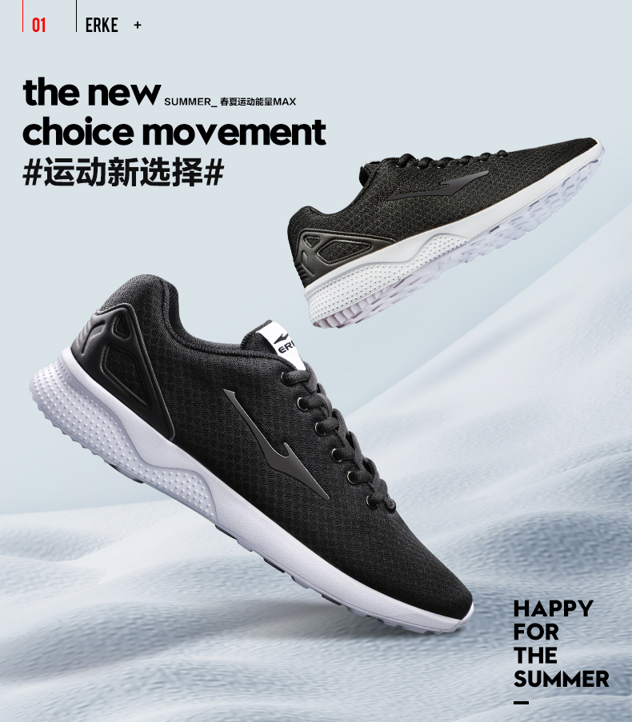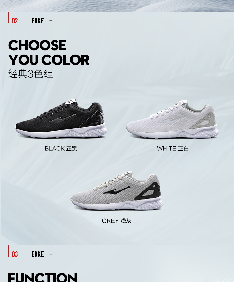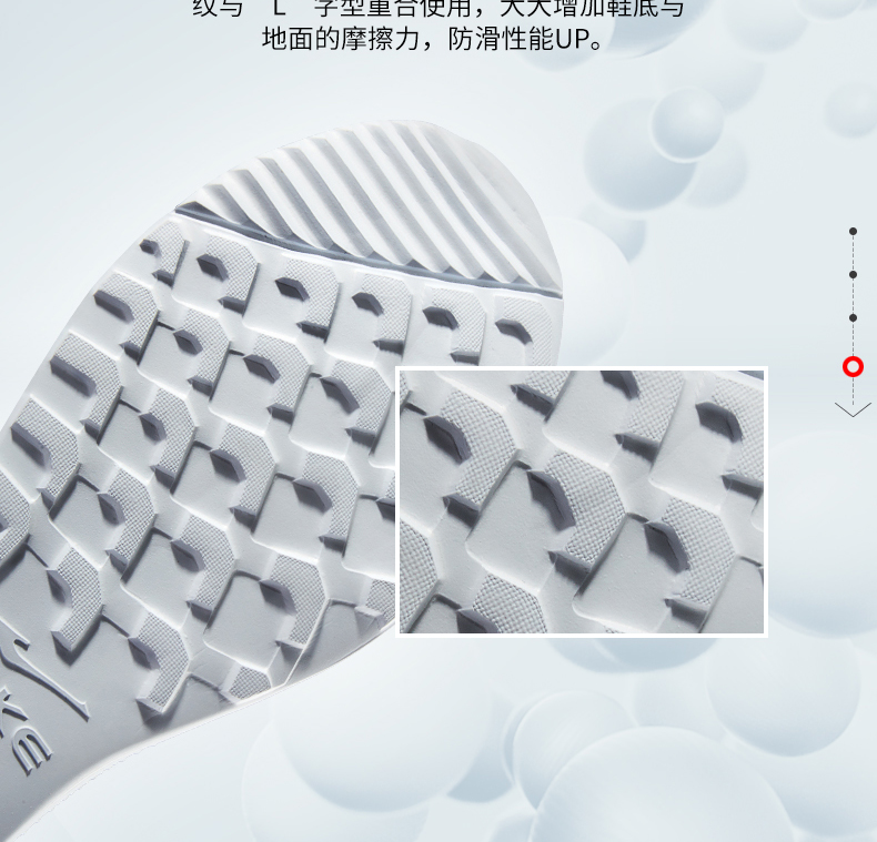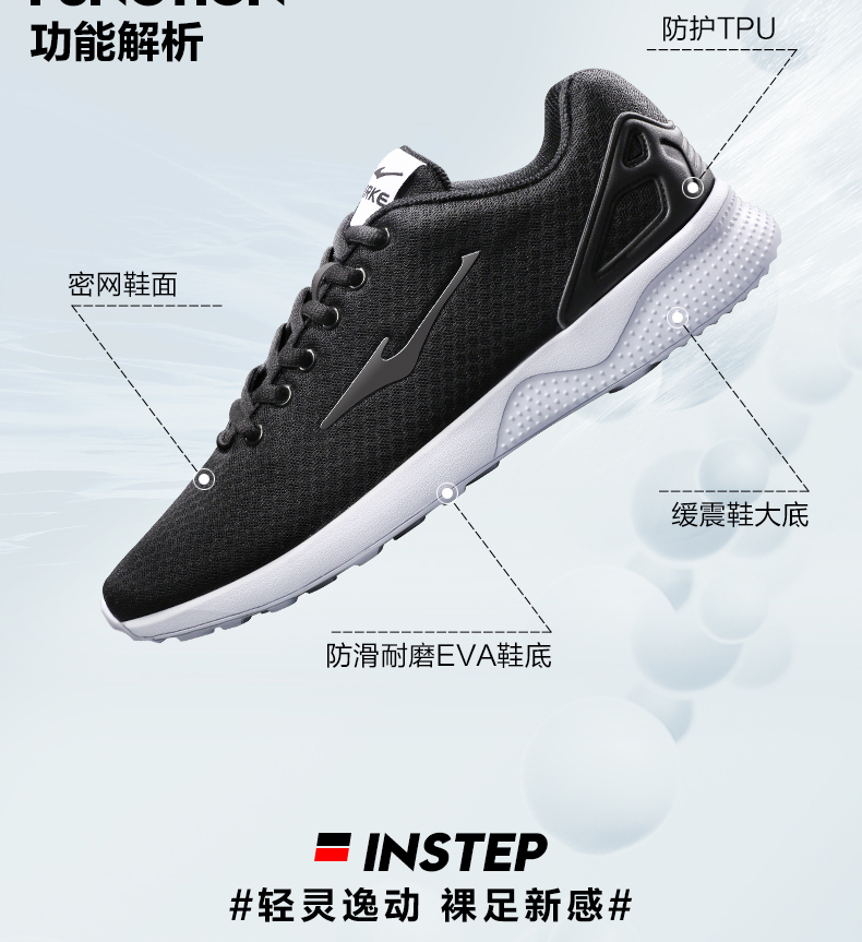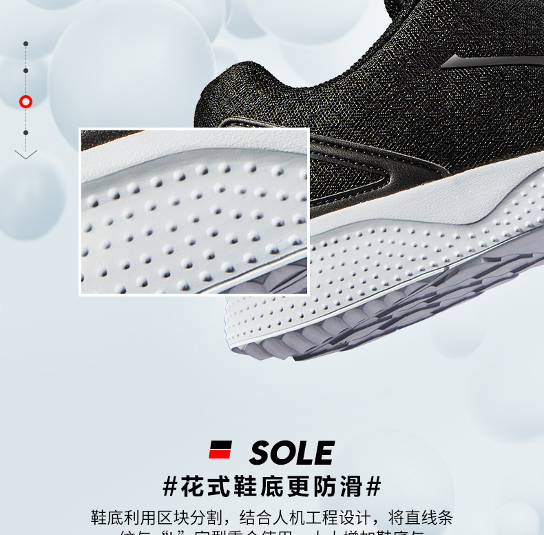 网布鞋面加大孔网布,织物内里增加舒适,运动时保持脚面透气干爽。超轻EVA鞋底,单只仅重100g,为双脚带来减震、防滑的同时,带来超轻跑步体验。