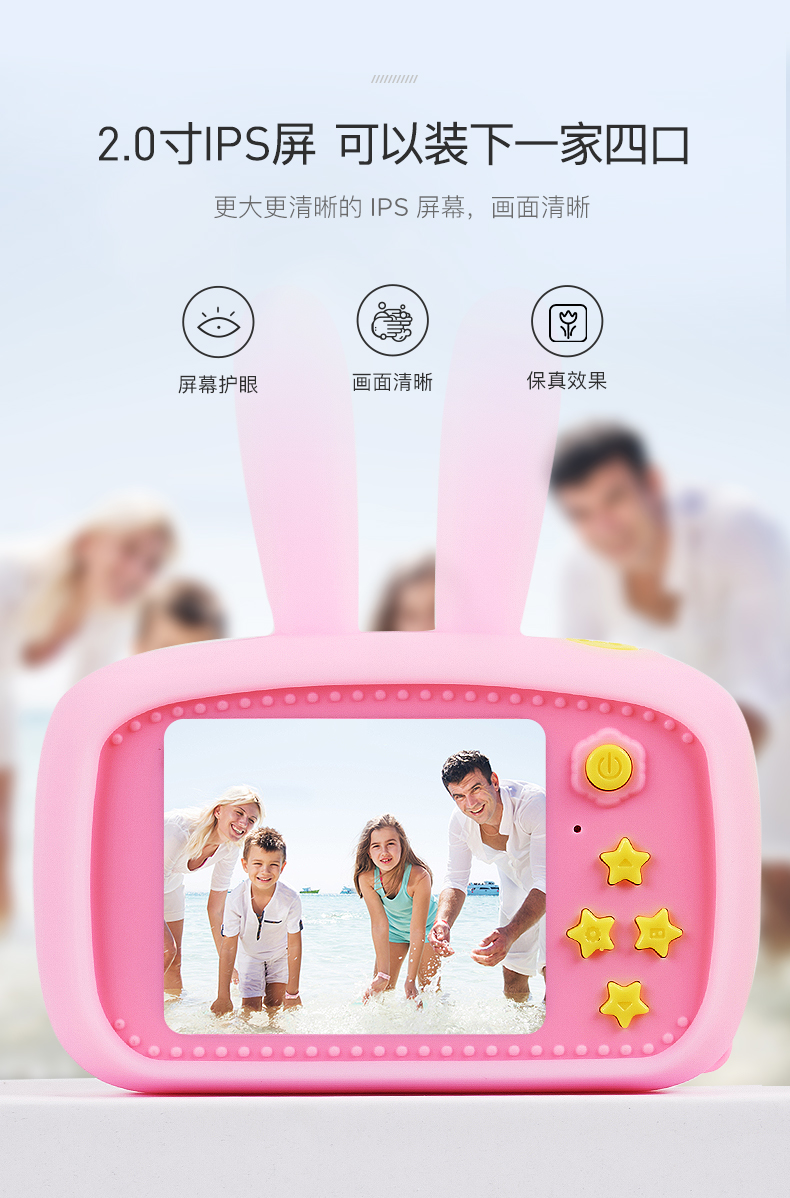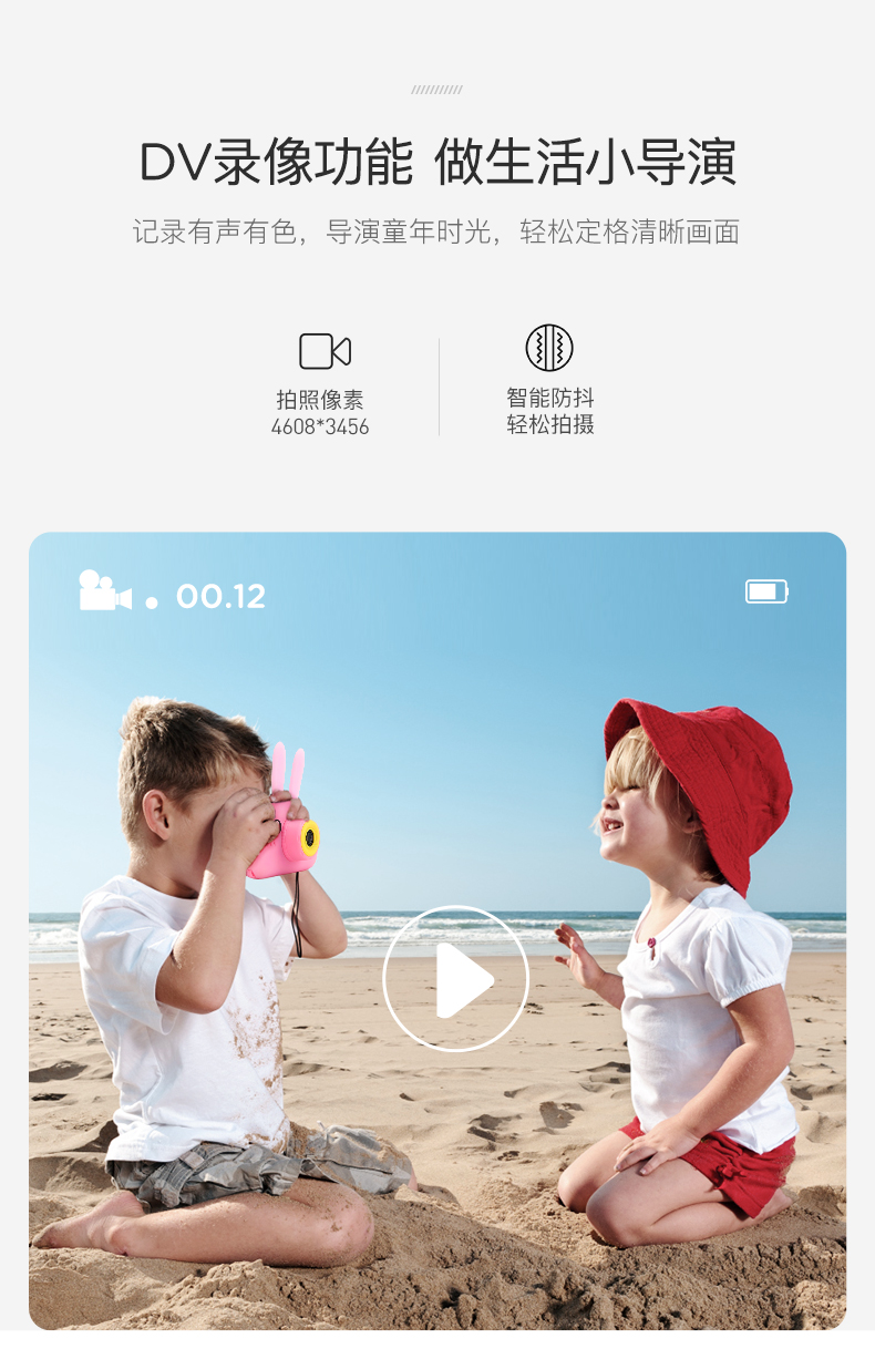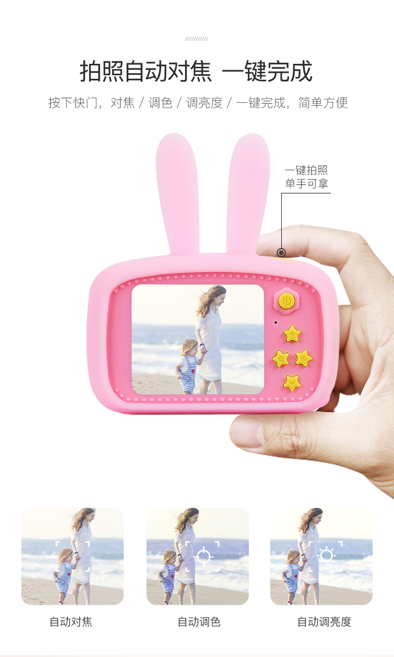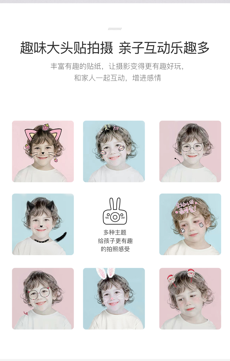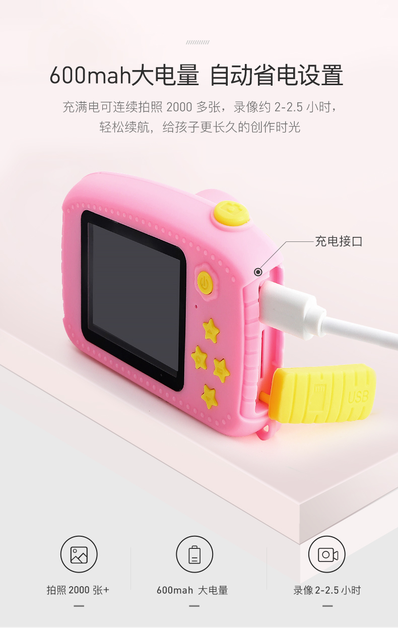 裸机经过暴力跌落测试,防摔耐用。具备DV录像功能,玩法多样。600mah大电量,充满电可连续拍照2000多张。内置趣味大头贴,都是孩子喜欢的卡通元素。