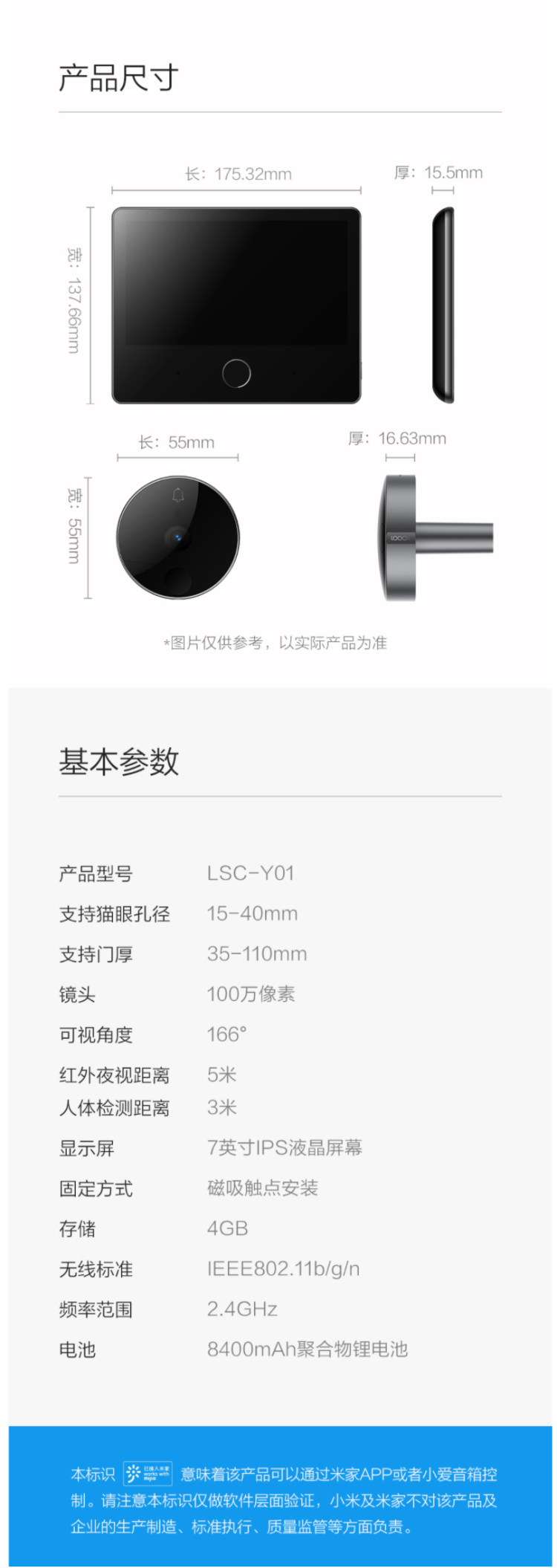 在安装方面,创新磁吸式触点设计,内门支架和显示屏拿取方便,超强固定。适配的猫眼孔径范围:14-55mm,适配门厚45-95mm,基本上适应市面上大部分外户门。不适用于两重防盗门、不含猫眼的防盗门或门上带小窗和钢网的防盗门。